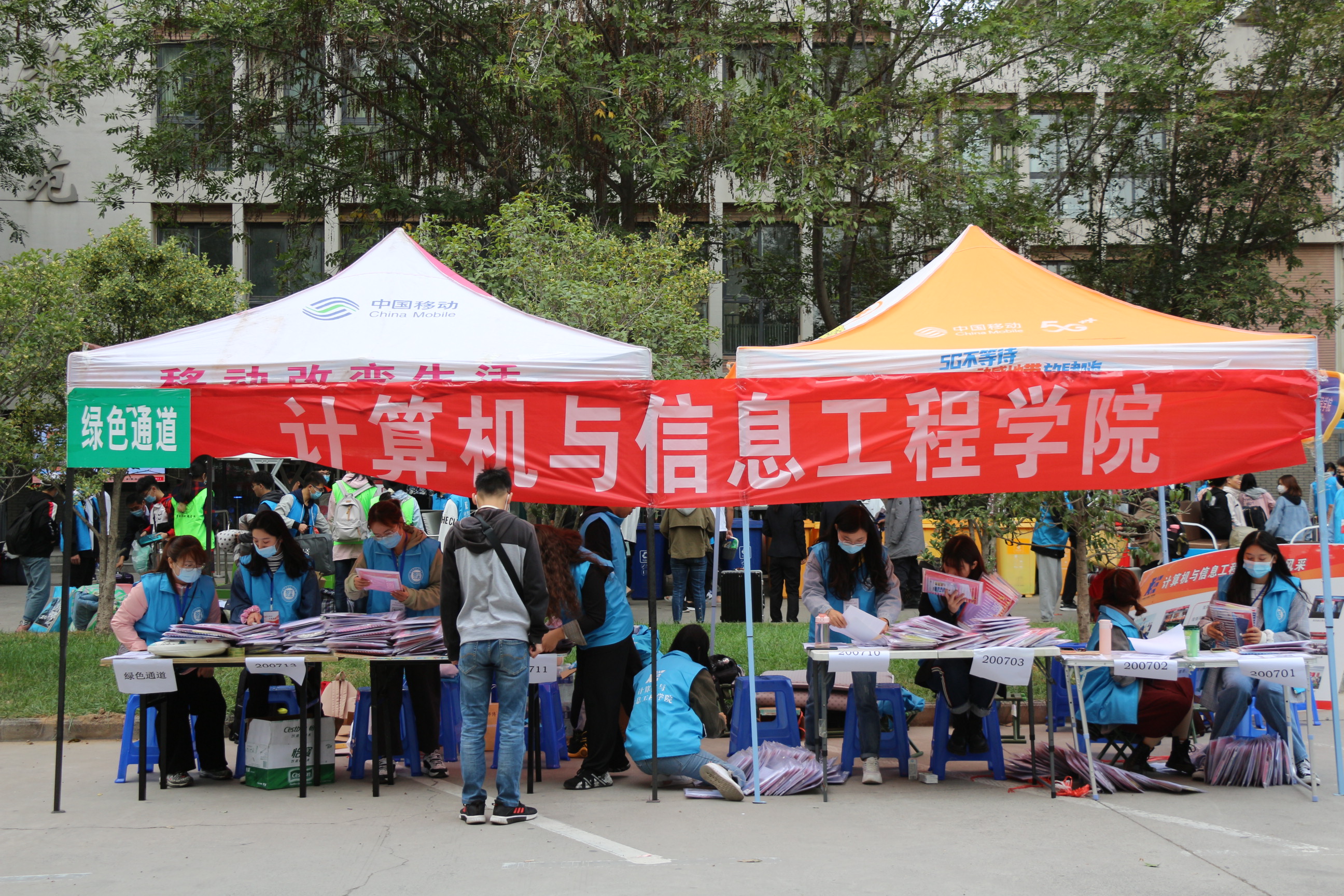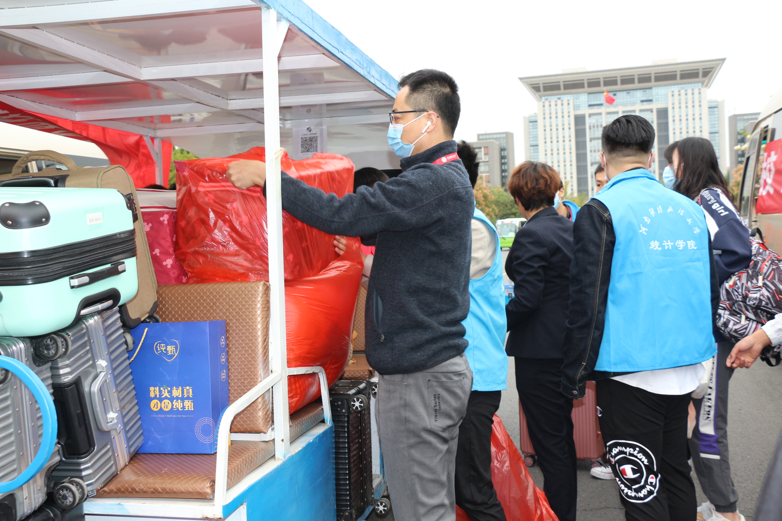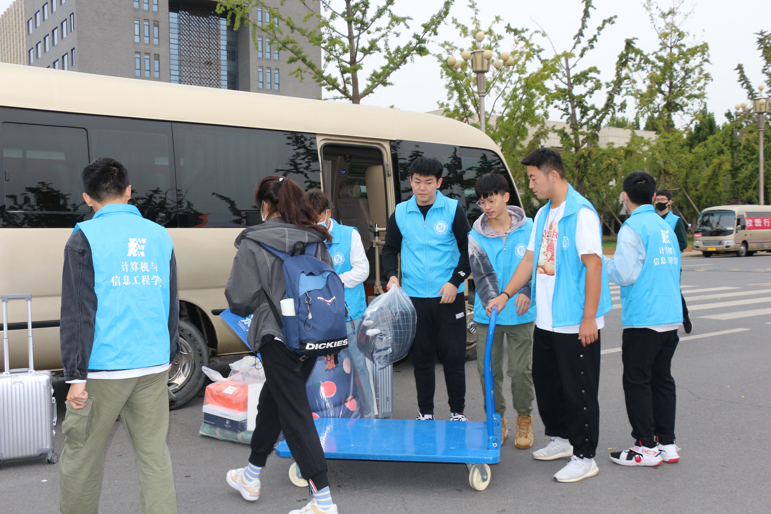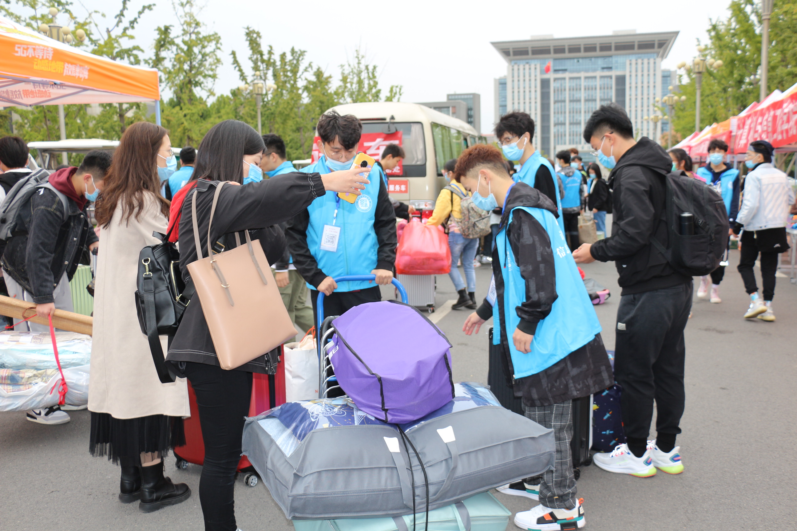 为保障迎新工作高效有序的进行,我院根据学校防疫报到原则,提前开展迎新动员会议,并设立迎新接待处协助新生报道。在校外迎新站点,志愿者们一早便抵达火车站、汽车站,帮助新生搬运行李,新生在扫描防疫健康码后,即可直接乘坐校车入校。人头攒动,来来往往,迎新工作井然有序地进行。