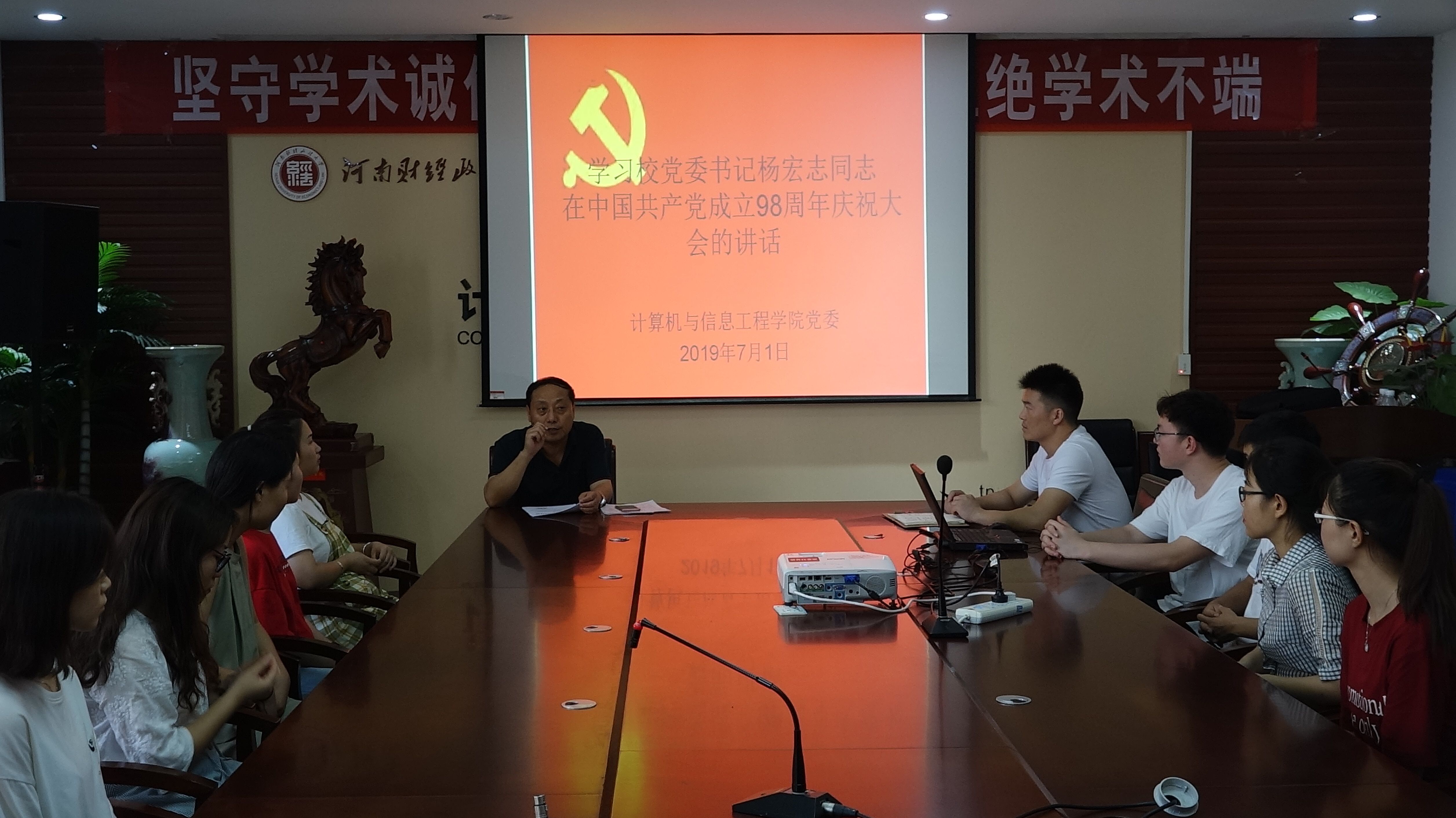71日,williamhill英国党员在党委书记刘泮振的带领下,于学院314会议室开展了主题为“学习校党委书记杨宏志在庆祝中国共产党成立98周年暨表彰大会上讲话”的集中学习活动。