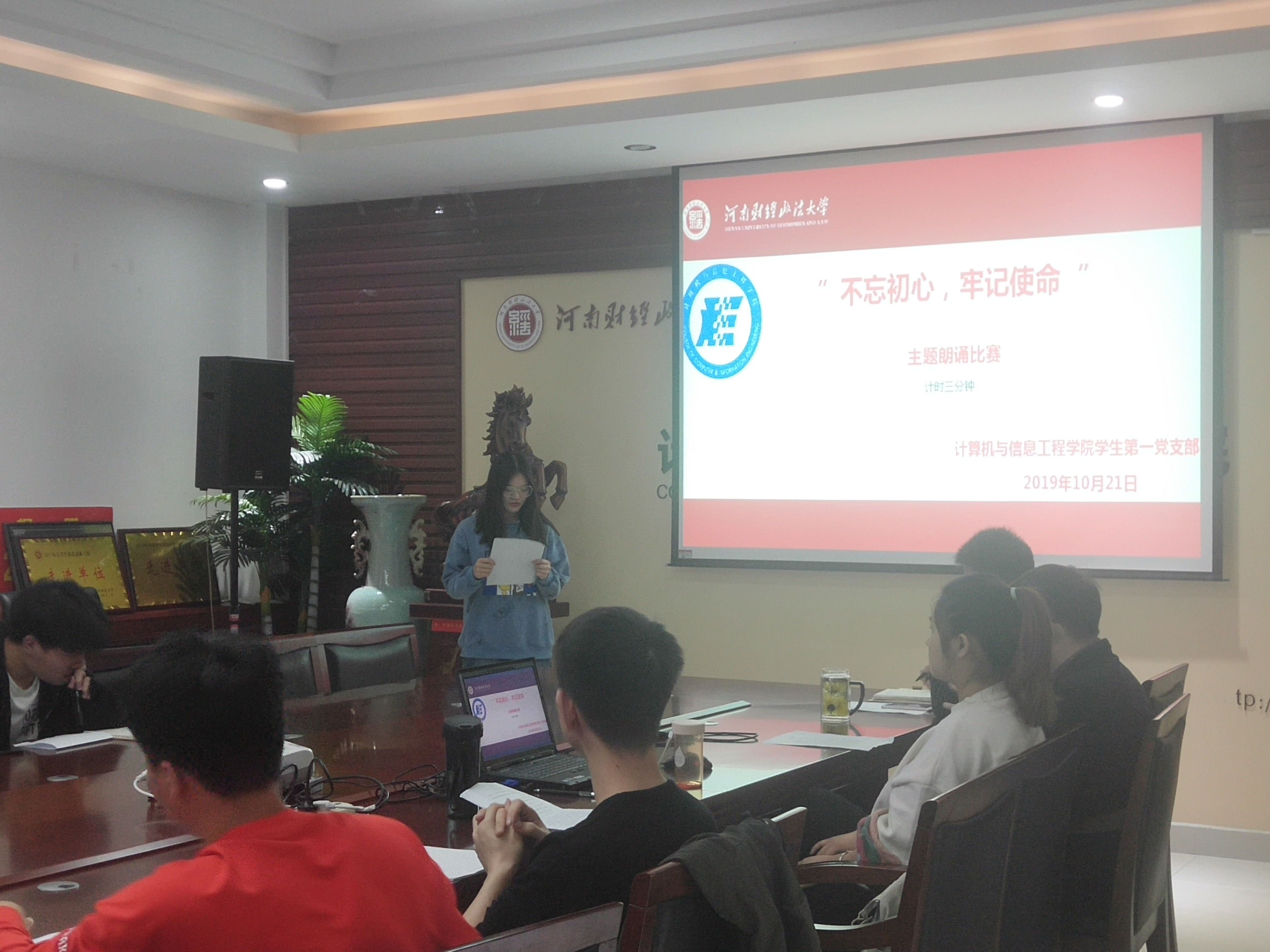 2019年10月21日晚19:30williamhill英国学生第一党支部于院办314举行“不忘初心、牢记使命”主题教育朗诵比赛,该活动由支部书记刘振主持,学生第一党支部全体党员参加。