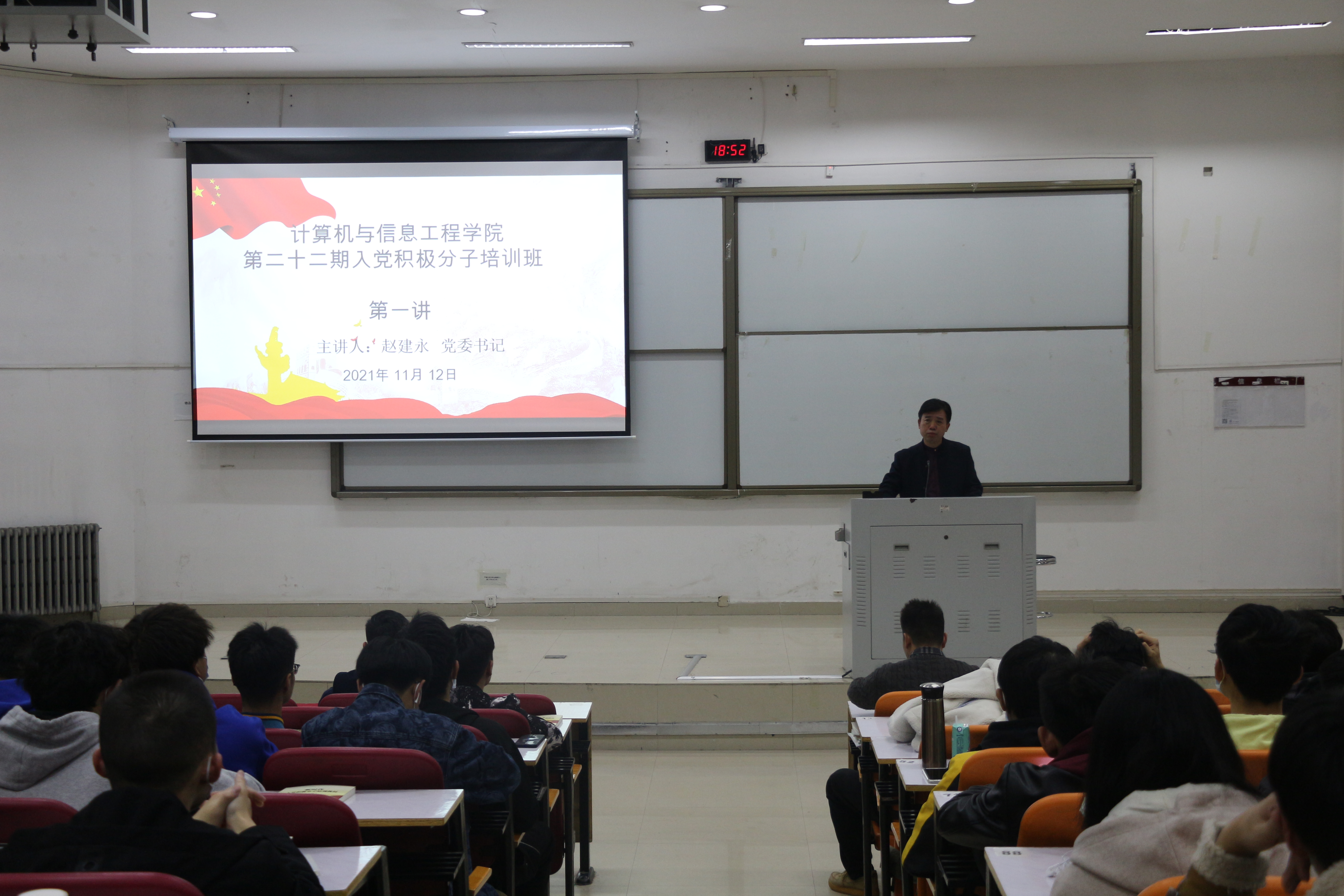 为让我院入党积极分子能够全面熟悉和尽快掌握党的基本知识、基本理论,提高政治理论水平和思想政治觉悟,进一步端正入党动机,明确入党目的,坚定共产主义理想信念,11月12日晚我院于教二219举行第二十二期入党积极分子培训班开班典礼暨第一次培训。典礼在庄严的《国际歌》中拉开帷幕。我院党委书记赵建永、党委副书记常建出席典礼,辅导员刘振老师主持活动。