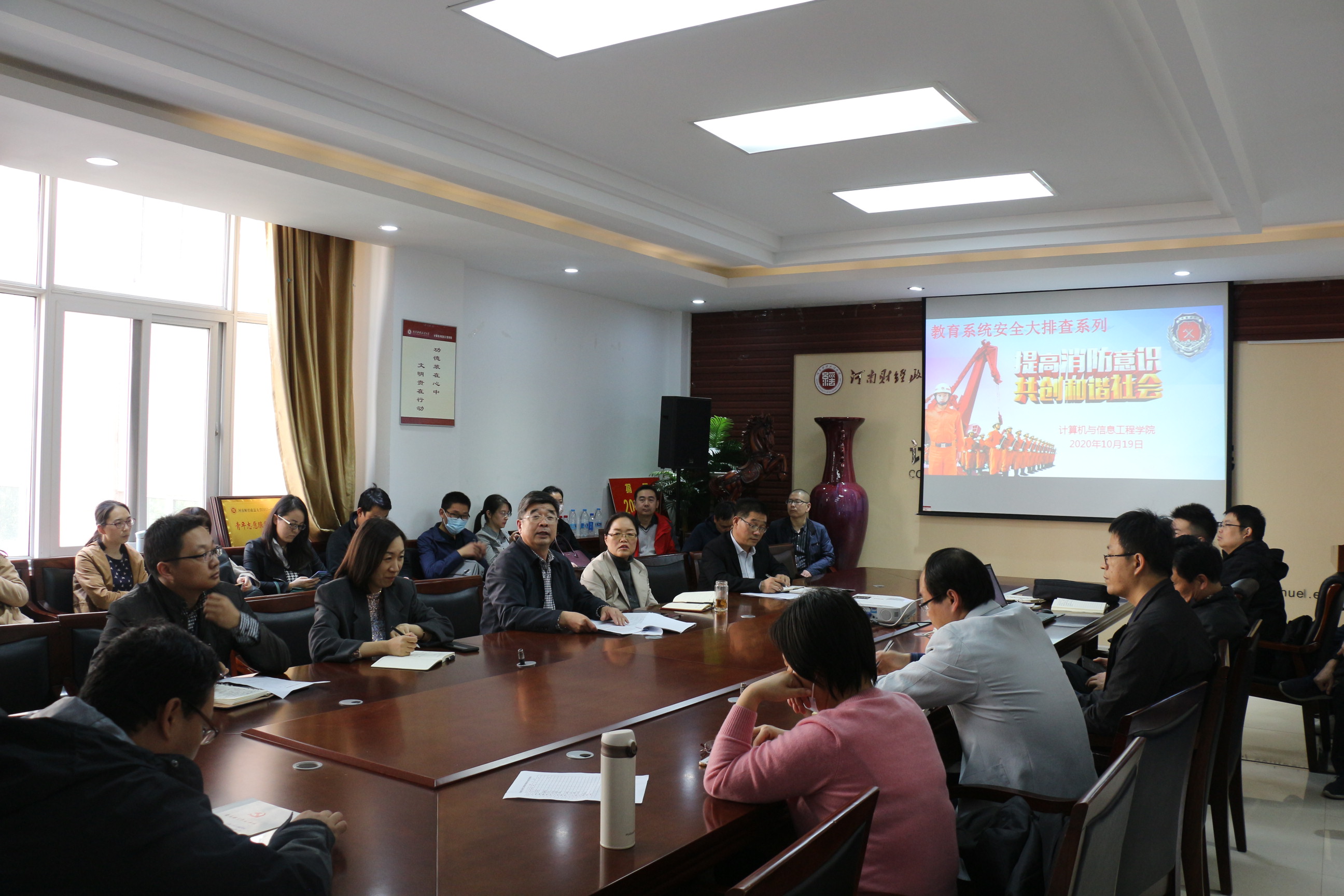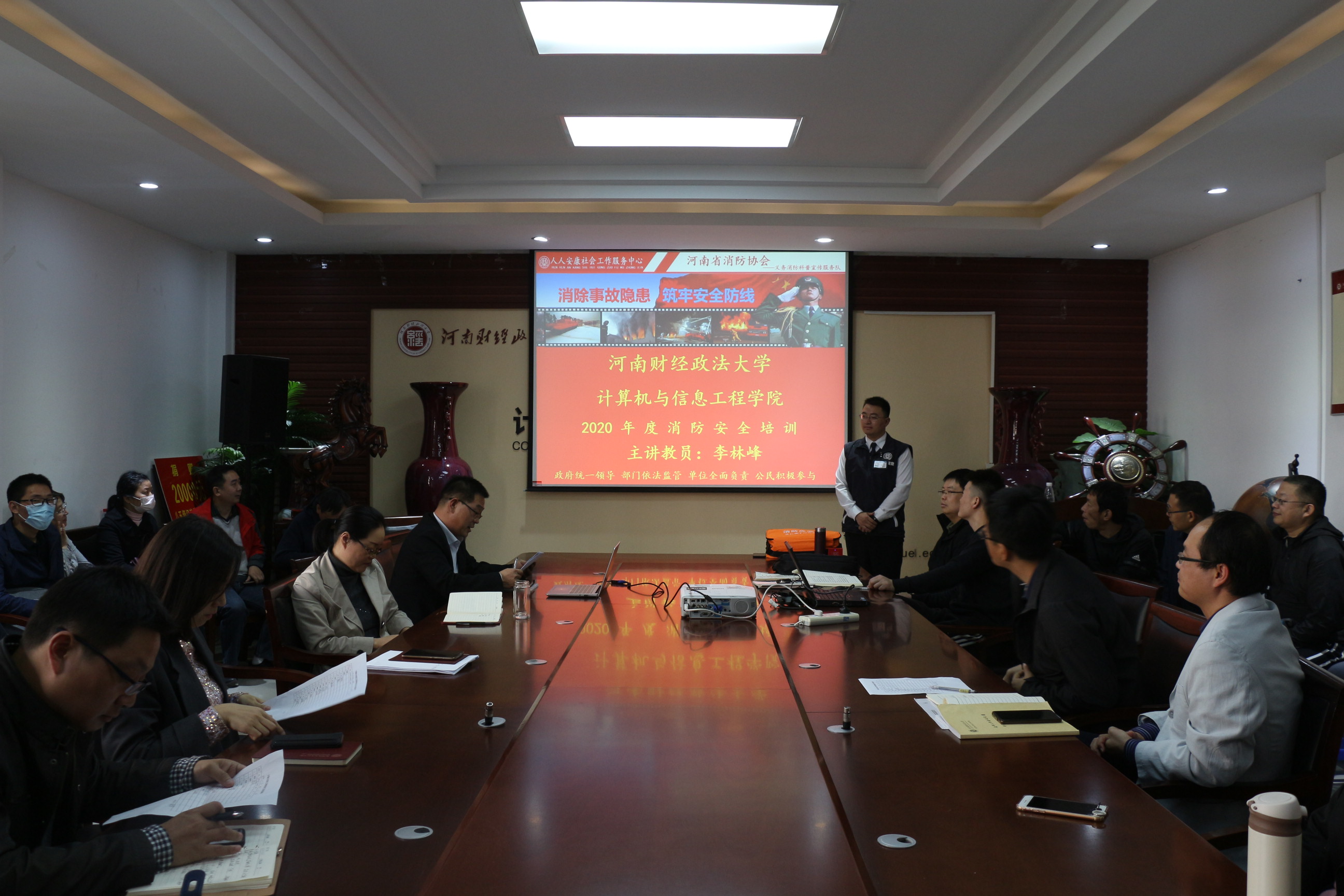 为进一步提高广大教职工的消防安全意识、火灾应急处置能力和自防自救能力,按照《河南省教育厅办公室关于开展全省教育系统安全大排查的通知》要求,10月19日,williamhill英国分工会在学院会议室举办了主题为“消除事故隐患,筑牢安全防线”的消防安全知识培训沙龙,河南省消防协会专职教员李林峰受邀主讲,学院全体教职工参加。