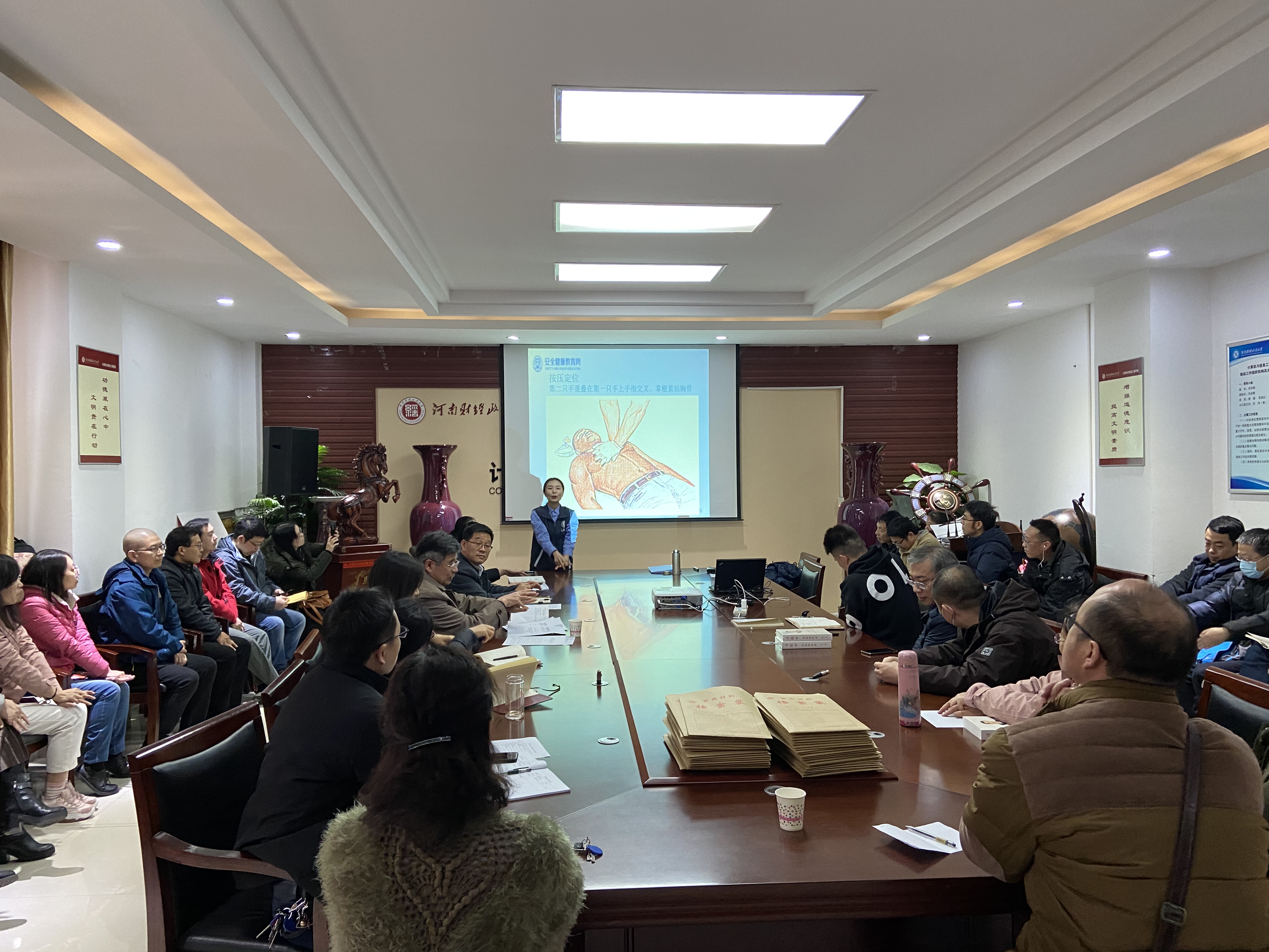 胡金磊老师从秋冬季常见突发疾病切入主题,主要讲解了三个方面的知识技能:一、职业病的预防和治疗;二、突发疾病的紧急救护技能;三、健康生活方式的养成。讲解现场,为了让大家快速、深刻地记住一些复杂的操作技巧,还特意通过示意图、实际操作等进行解析,生动形象地展现了现场施救技能,通俗易懂地介绍了职业病防范常识和辅助治疗等方面的知识技能,现场不时响起阵阵热烈的掌声。