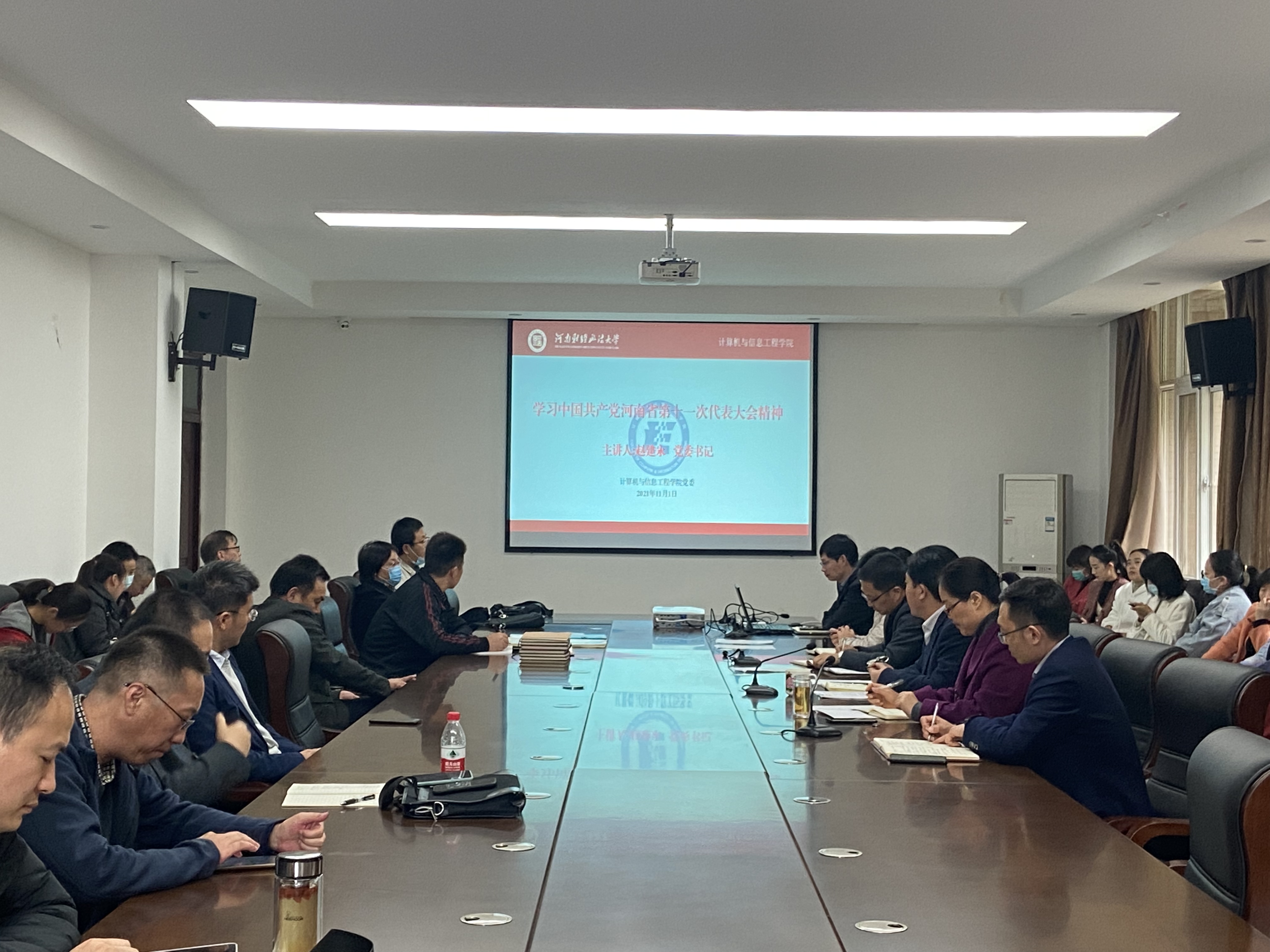 11月1日下午,学院党委在院办315会议室召开全体教职工大会,会议内容为学习中国共产党河南省第十一次代表大会精神,学院党委书记赵建永领学,全体教职工参加。