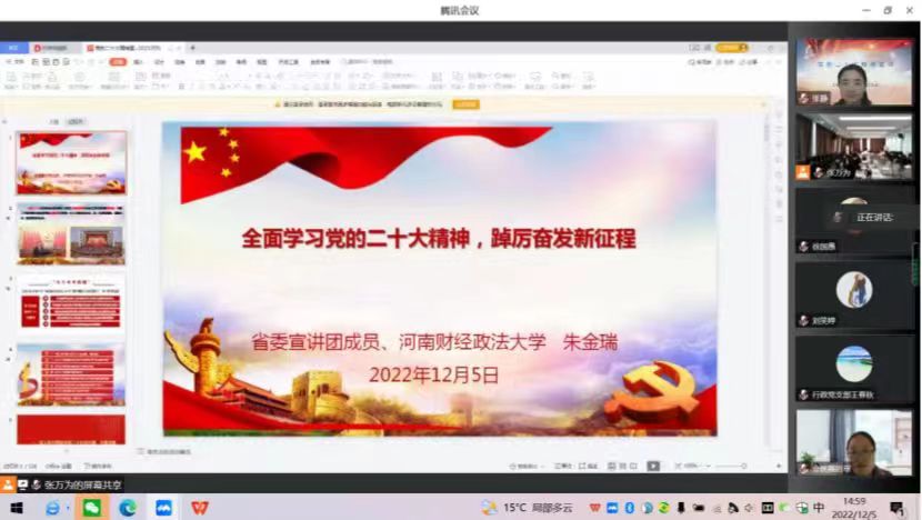 12月5日下午,我校副校长朱金瑞教授应邀为我院师生宣讲党的二十大精神。活动由院党委书记赵建永主持,采用线上、线下相结合的方式进行,学院领导班子成员、各党支部书记、部分师生代表聆听了此次宣讲。