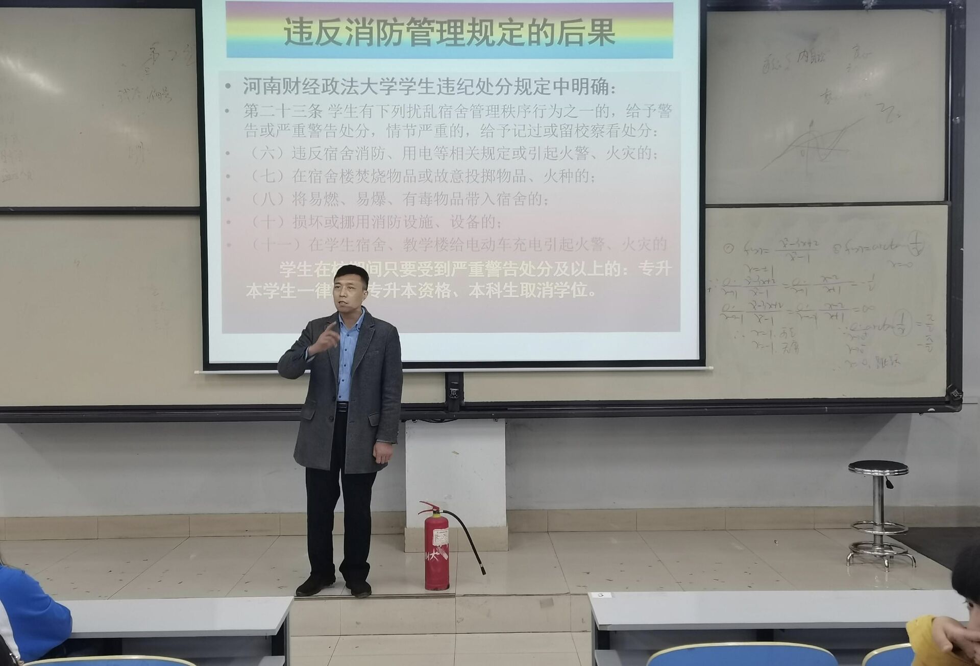 在本次讲座上,吴老师分别向新生们讲解了电信诈骗、消防安全、防盗、防交通事故、防范传销和毒品、防范恐怖袭击、防宗教渗透七个方面的安全问题。在讲解消防安全问题时,吴老师利用现场的灭火器,向同学们详细讲述其使用方式及注意事项。并通过列举现实案例、播放案例视频的方式,向同学们指出了安全防护知识缺失而造成的危机与隐患。同时,他还向新生们简单介绍了窃贼偷盗的惯用伎俩,希望新生们注意防盗,时刻保持警惕。最后,吴老师表示,希望同学们能够通过本次交流,进一步了解安全防范常识,建立正确的人生观、价值观,为和谐校园的建立贡献自己的一份力。