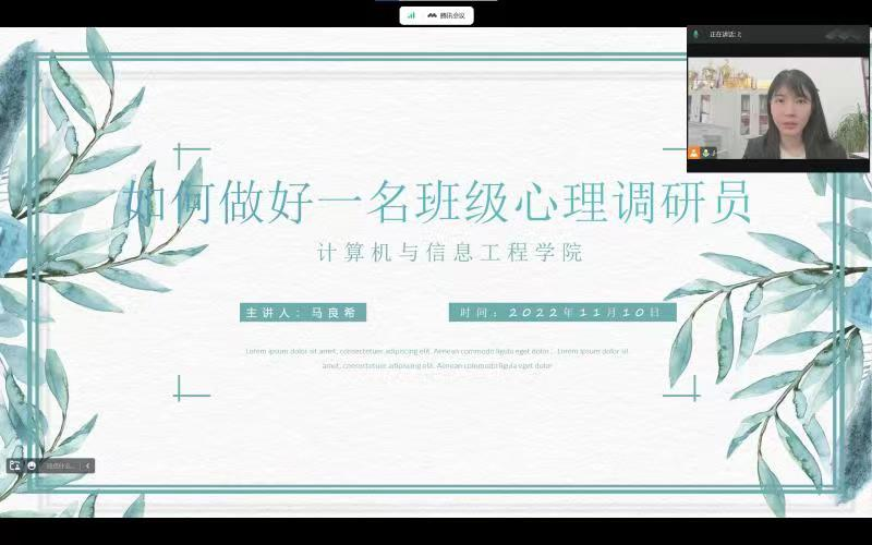 为进一步加强常态化疫情防控形势下的心理健康教育工作,提高我院班级心理调研员的心理教育素养能力,更好的帮助同学们解决心理问题,促进学校德育工作发展,我院于2022年11月10日在线上举办了班级心理调研员培训。心理健康对一个人的发展至关重要。这次培训是由马良希老师主持进行,培训中向班级心理调研员们谈论了几种方法,通俗易懂,极具知识性、趣味性。