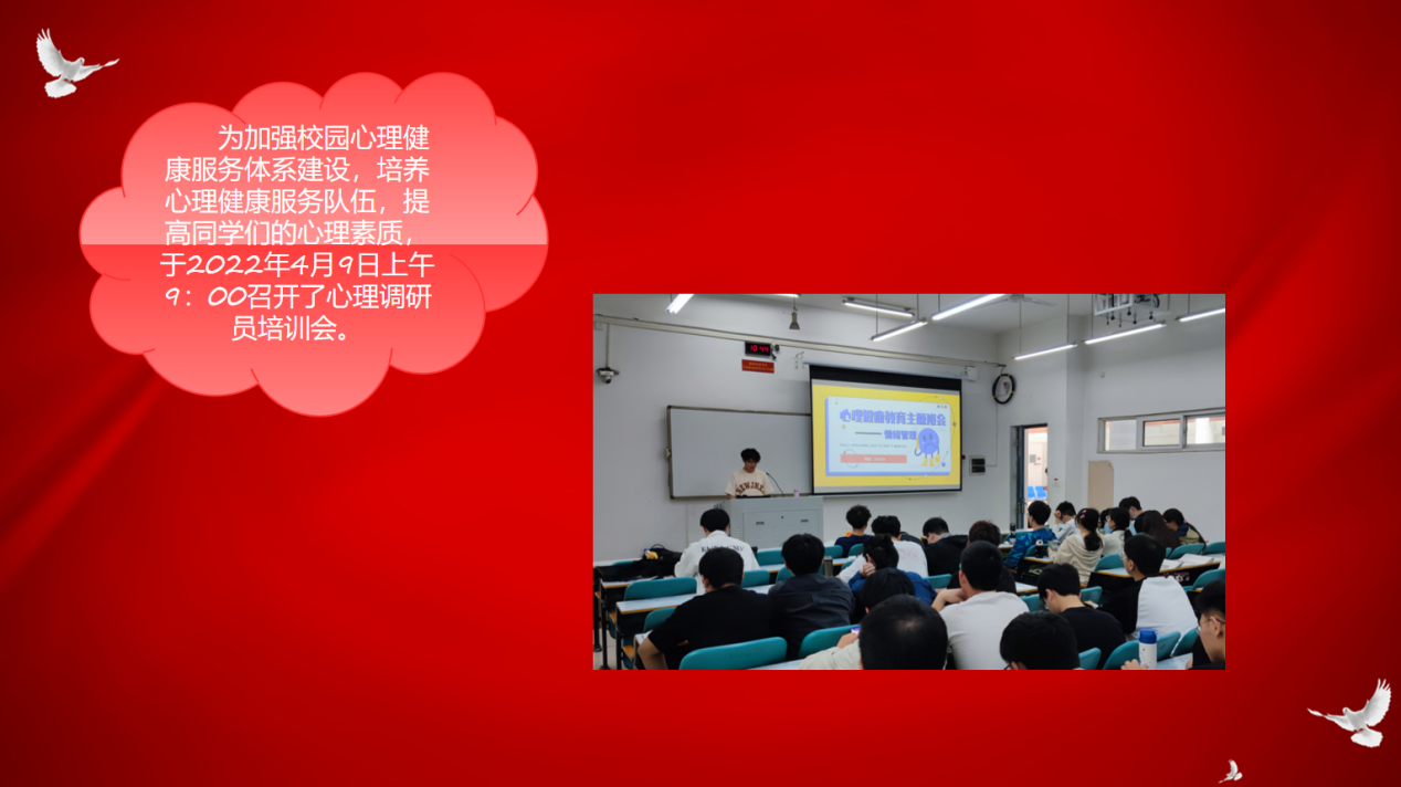 为加强校园心理健康服务体系建设,培养心理健康服务队伍,提高同学们的心理素质,williamhill英国于2022年4月9日上午九点举办了班级心理调研员培训会。