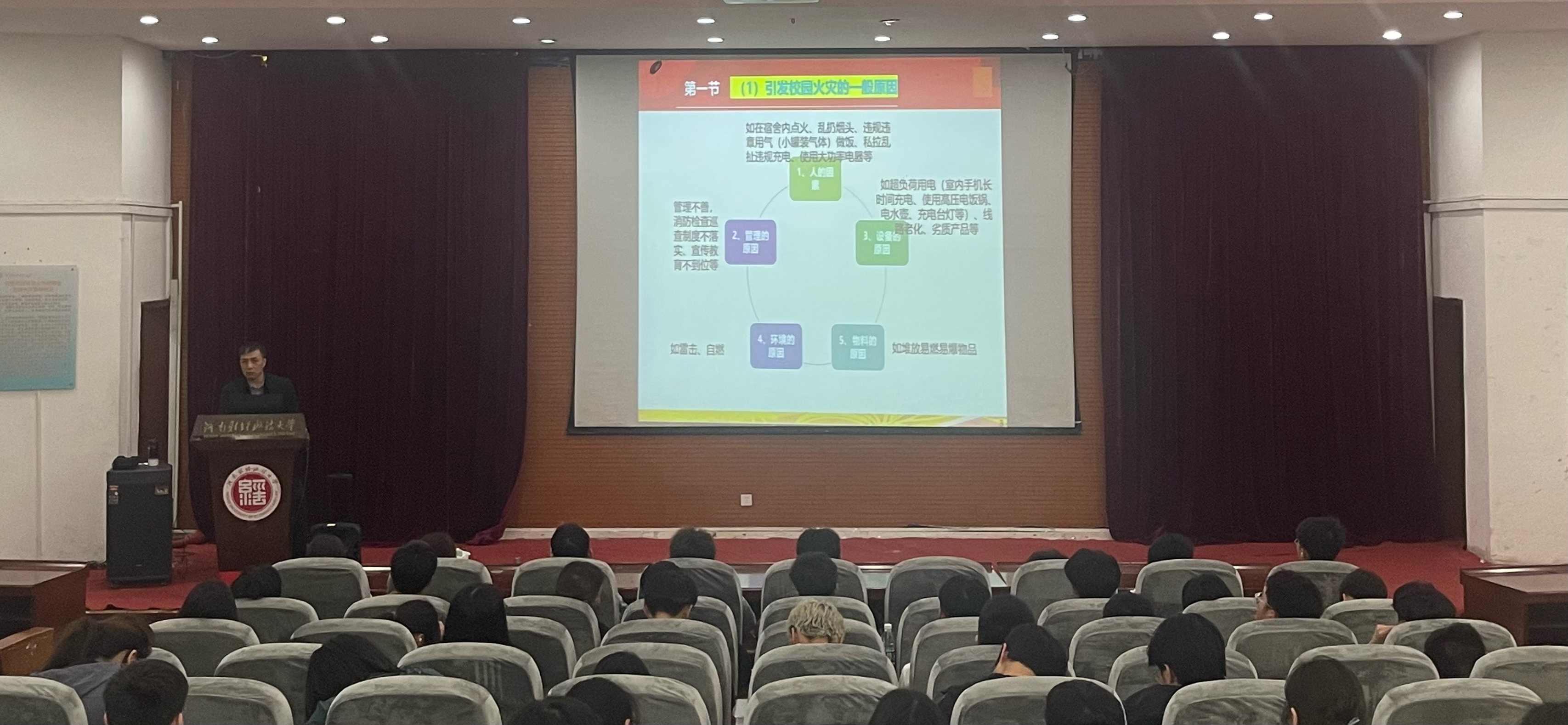 为了提高学生消防安全意识,增强学生的应急处理能力,williamhill英国于2023年10月31日晚7点在教一220报告厅组织开展了消防教育培训讲座,报告邀请保卫处消防科吴庆主讲,辅导员赵晨阳主持,2023级学生代表200人参加了此次消防教育培训。