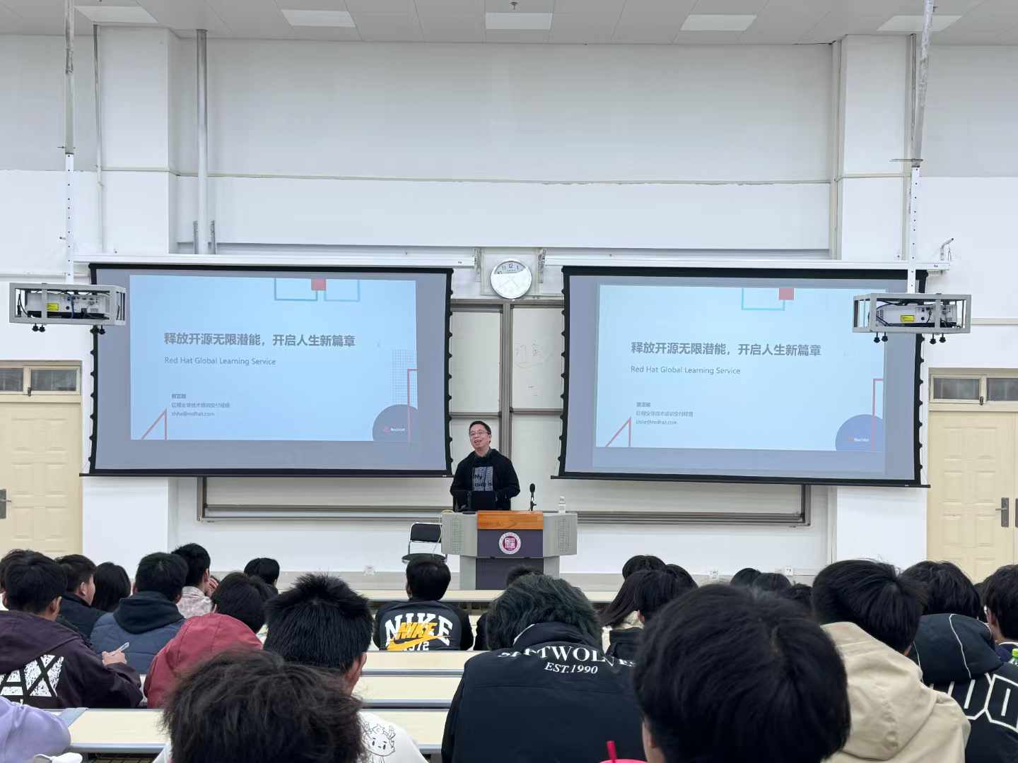 12月3日,红帽全球技术培训部资深交付经理贺正刚受邀为软件工程(DNIIT国际认证方向)的500余名学生举行了Linux前沿技术讲座。贺正刚系红帽大中华区讲师团队负责人及Tech Lead、红帽全球讲师委员会委员,荣获红帽 2019 年度亚太最佳讲师等多项殊荣,拥有红帽认证架构师(RHCA Level XIV)、红帽认证讲师(RHCI)、红帽认证考官(RHCX)等多项专业认证。