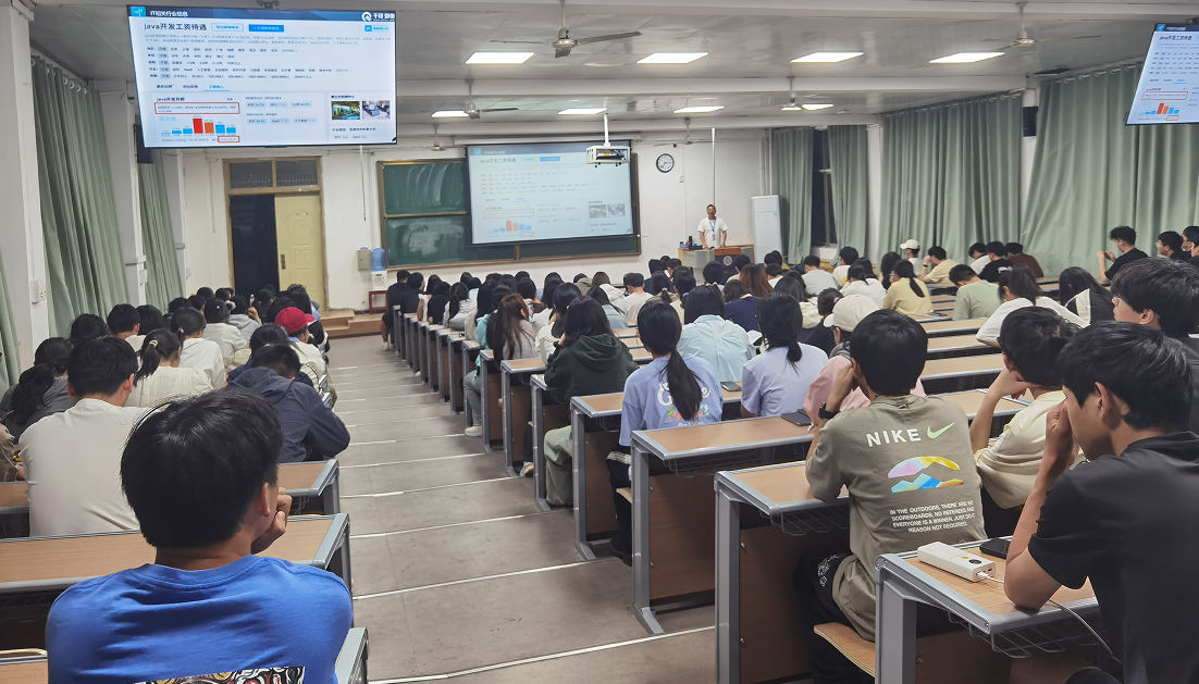 4 月 24 日晚,北京千锋互联科技有限公司郑州分公司技术总监王博主讲的“DT 时代互联网热门技术发展趋势分析及高薪机遇”报告会同样吸引了众多学生。王博剖析了 DT 时代互联网技术与传统行业的深度融合现状与趋势,指出 AI 技术催生了新的应用场景和商业模式,为学生的职业发展提供了多元选择。