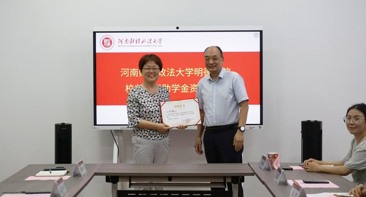 6月16日下午,一场温暖人心的校友捐赠助学金资助仪式在文化路校区明德书院举行。学院党委书记蔡伟峰、院长李淑红、副院长秦军、冯新扬,明德书院党委书记王廷伟、副书记何海涛等领导、老师以及受助学生参加捐助活动,活动由明德书院党委副书记王帅主持。