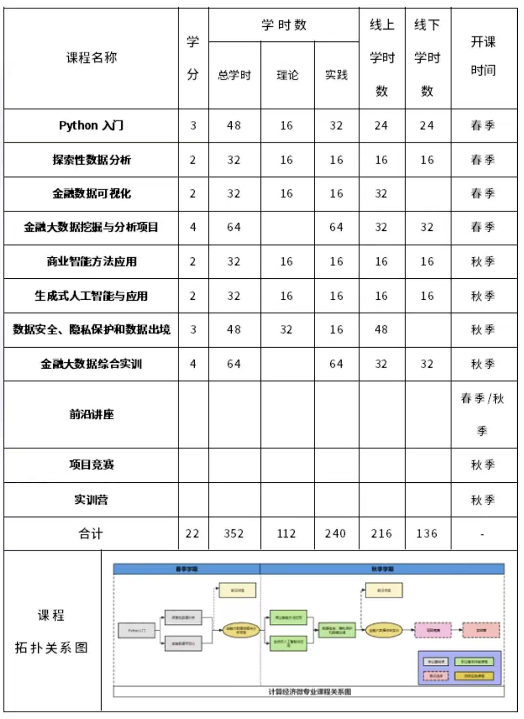 “计算经济”微专业培养目标:培养具有扎实数字经济数据分析能力和良好逻辑思维能力,系统掌握数据科学理论和数字经济数据分析技术,胜任数字经济领域数据处理、分析与可视化等工作的应用型、复合型专业人才。