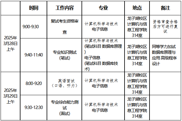 备注:以同等学力参加复试的考生,需要加试《数据库原理与应用》和《高级程序设计》,加试形式均为笔试,每门课程满分为100分,每门课程考试时间为120分钟。