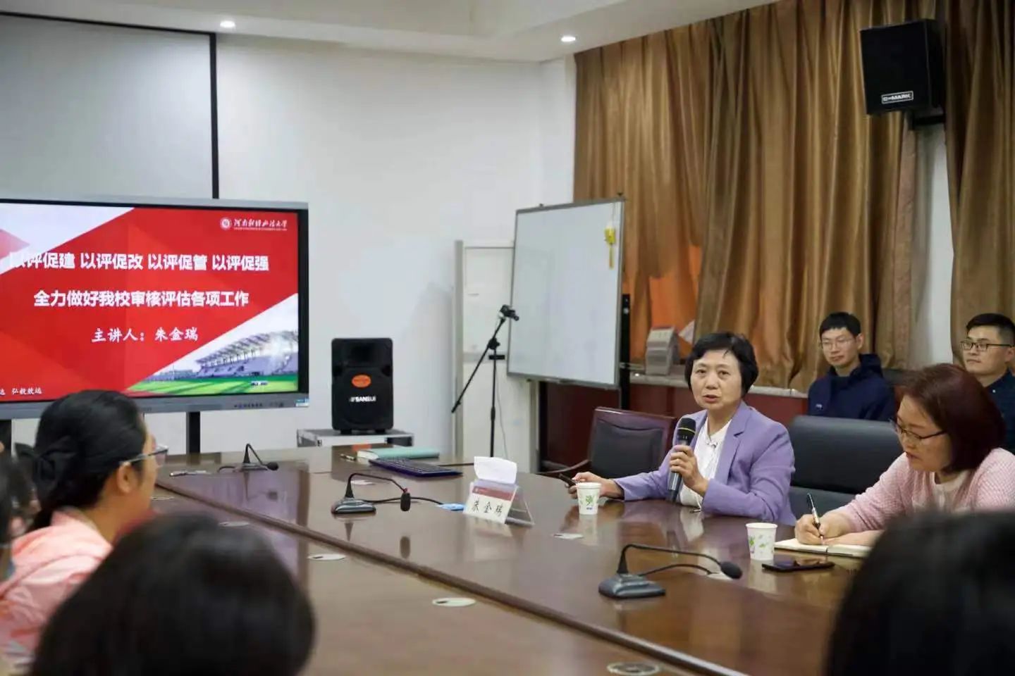会议伊始,赵建永通报了目前我院审核评估工作的进展情况以及实际工作中遇到的困难和解决思路。朱金瑞立足于“以评促建、以评促改、以评促管、以评促强”的方针,重点从新一轮审核评估开展的原因、指导思想、动向变化、工作程序等方面进行详细解读,同时,她也从方法举措、前期准备、重点关注要求等方面提出了实际的工作方向和要求。随后,她对我院在前期审核评估工作中的辛勤付出表示了肯定,并针对前期审核评估工作中发现的问题,提出了整改意见和建议。她指出,当前是学校申博的关键节点,审核评估工作事关学校教育改革与事业发展,是学校工作的“重中之重”,全院上下要充分认识其重要性和紧迫性,全面做好迎评的各项准备工作,扎实高效推动我校审核评估工作再上新台阶。