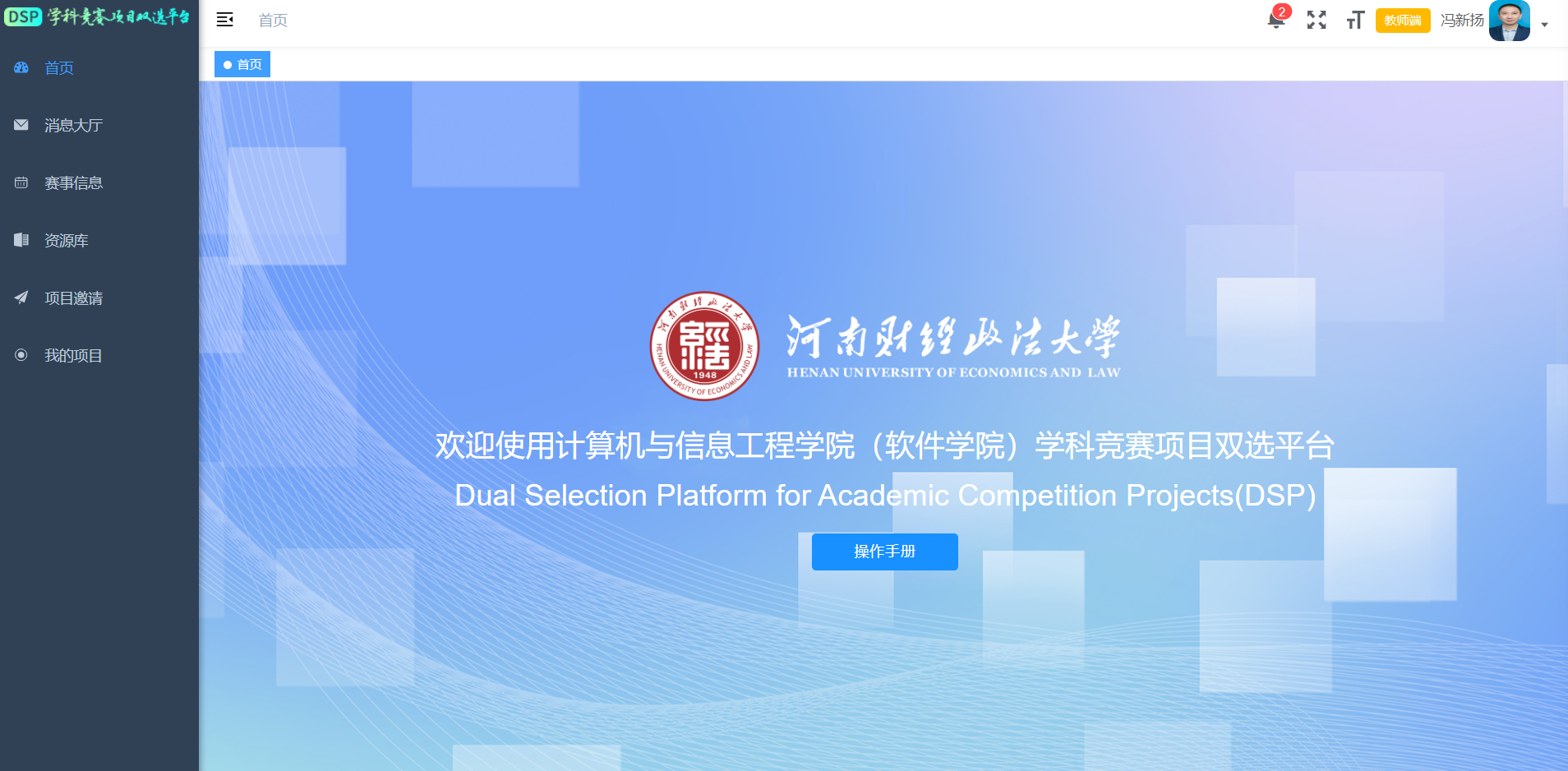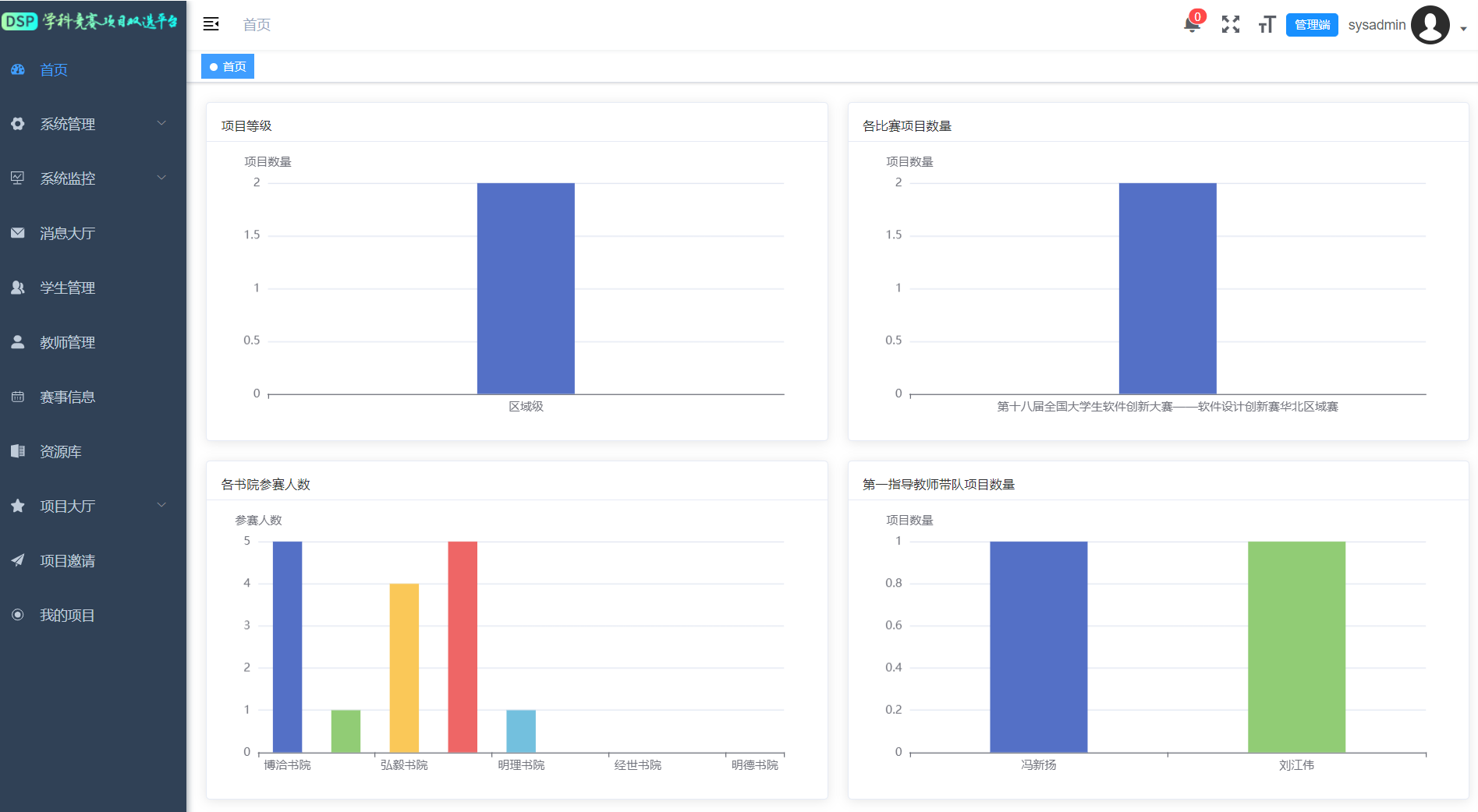 该平台实现了教师学生对于各类学科竞赛项目的双向选择,即教师发布项目学生报名或学生发布自主命题邀请教师指导。项目实行全流程管理,具有项目资源库查询以及对竞赛项目的智能化统计分析功能。