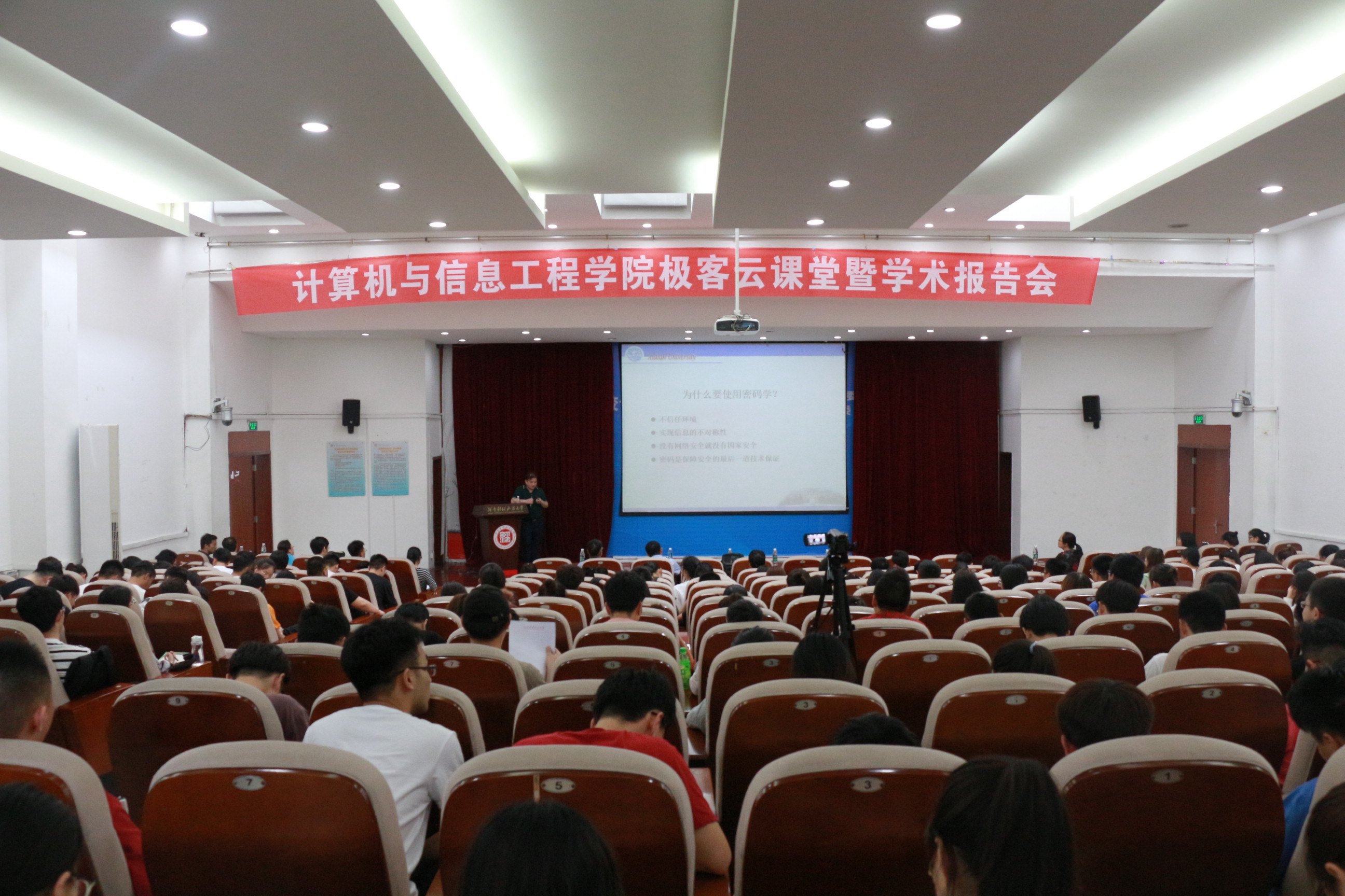 王保仓、朱辉、禹勇三位教授分别以“新型计算环境下的公钥密码算法”、“互联网环境下敏感数据隐私保护”、“可追踪门罗币:平衡密码货币的隐私与监管”为主题进行了讲授。教授们的讲解深入浅出,让同学们对公钥密码算法、数据隐私保护、云数据的使用等概念有了深刻的认识,也让大家认识到基于互联网的数据管理还存在不足。他们希望同学们能以积极的态度迎接未来的机遇和挑战,认真学习科学文化知识,为国家的互联网建设贡献力量。报告最后,同学们积极与专家交流互动,报告会圆满结束。