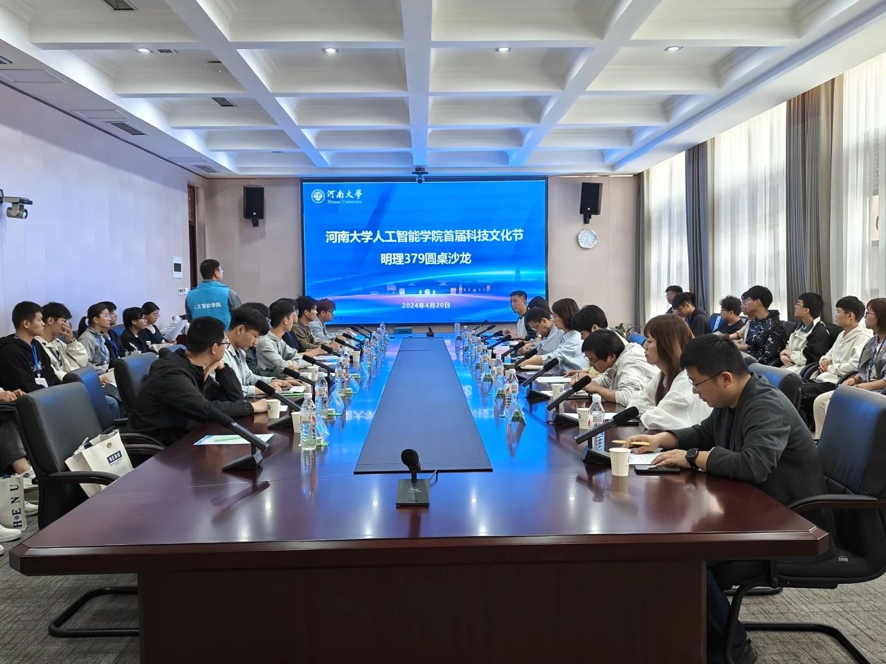 4月20日上午,我院人工智能专业4名学生代表参加河南大学人工智能学院举办的人工智能学院首届科技文化节——明理379圆桌沙龙。沙龙在河南大学郑州校区九章学堂南楼B座106会议室举行,主题为“发展新质生产力,AI时代年轻人何为”。