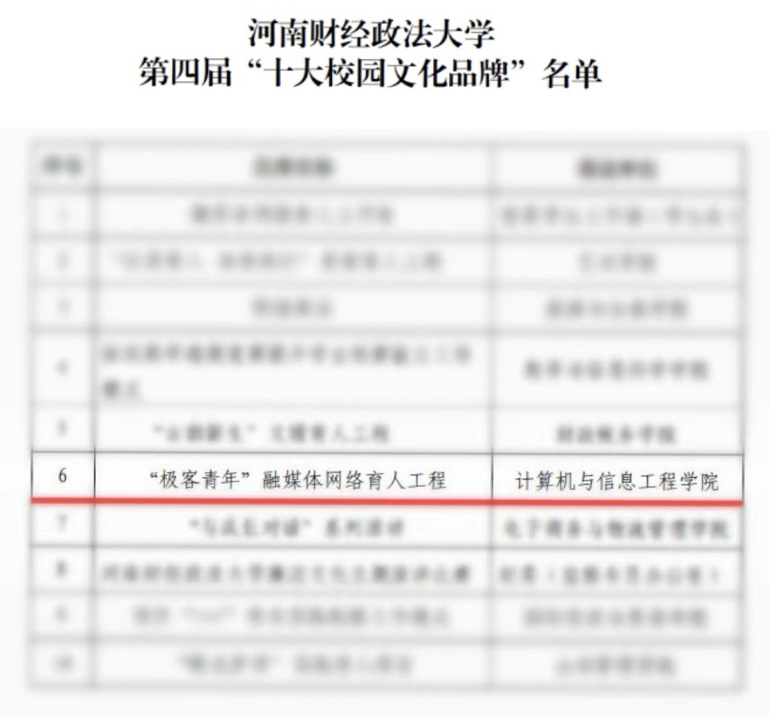 为深入学习贯彻习近平新时代中国特色社会主义思想和习近平文化思想,充分发挥文化传承创新功能和文化育人载体作用,我校组织开展第四届“十大校园文化品牌”评选活动。我院申报的“‘极客青年’融媒体网络育人工程”被授予“十大校园文化品牌”荣誉称号。