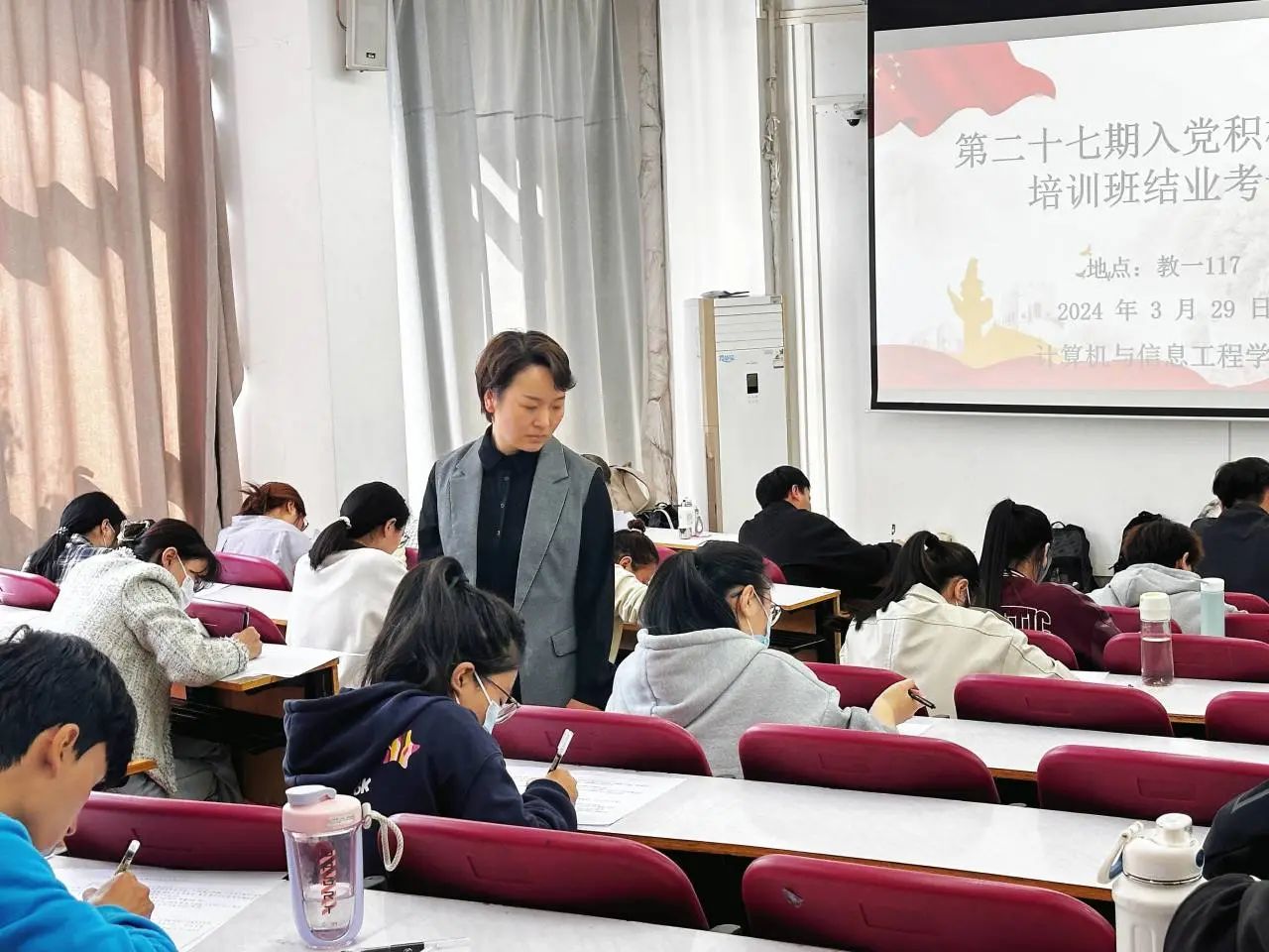 3月29日中午,我院第二十七期入党积极分子培训班结业考试在郑东校区教一117至120教室举行。学院党委副书记张晓静带队巡考,共200余名入党积极分子参加了此次考试。