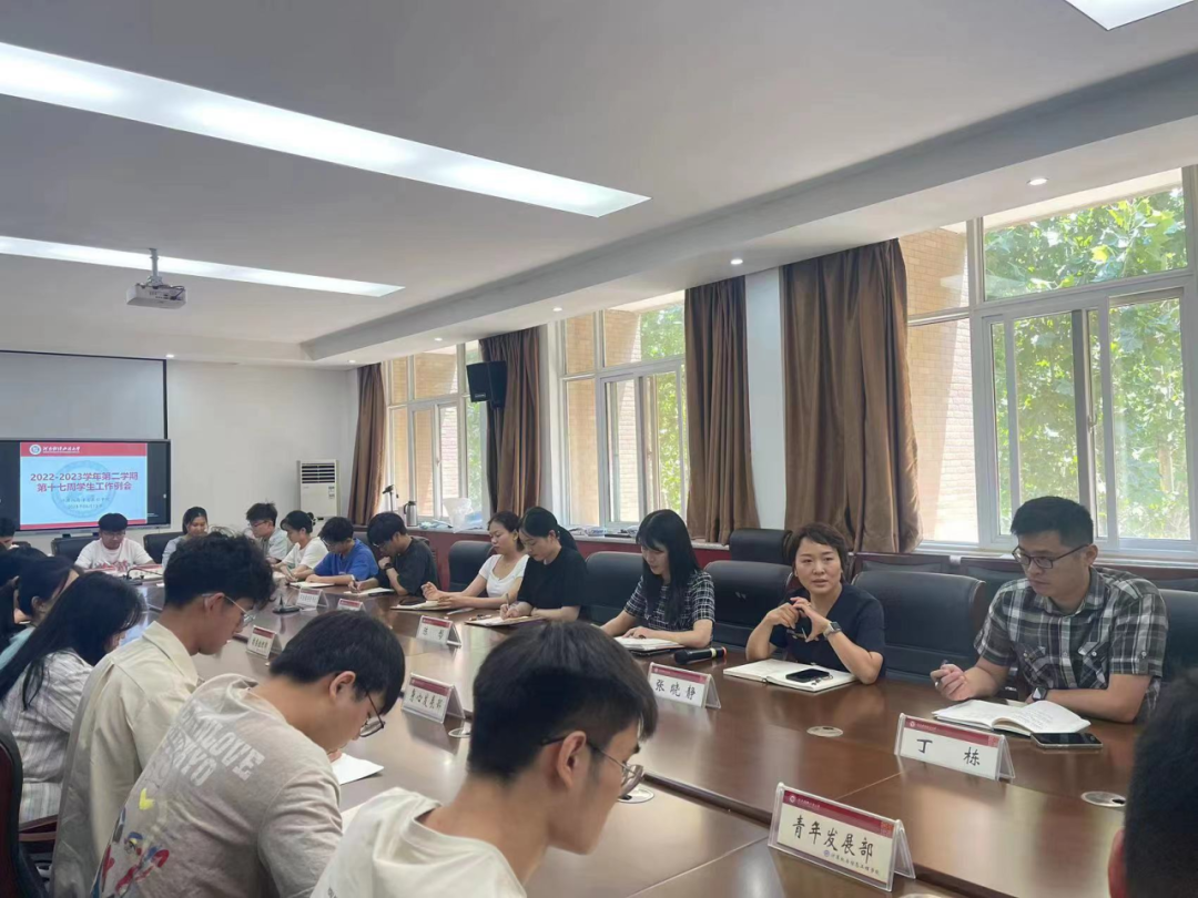 6月13日中午,我院2022一2023学年第二学期第十七周学生工作例会在学院315会议室举行。学院团委书记张晓静、团委副书记丁栋、全体辅导员老师、团委学生会部门负责学生和各班班委代表参加了此次会议,会议由丁栋主持。