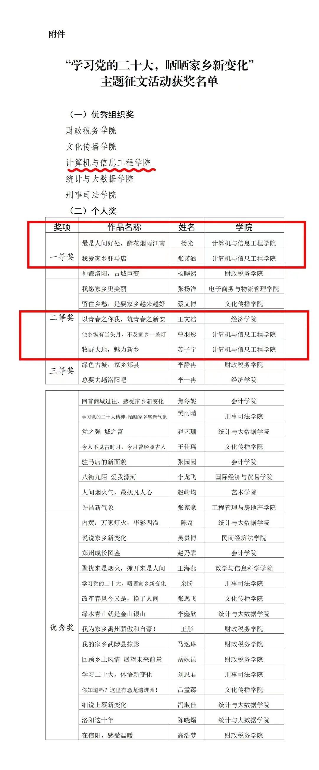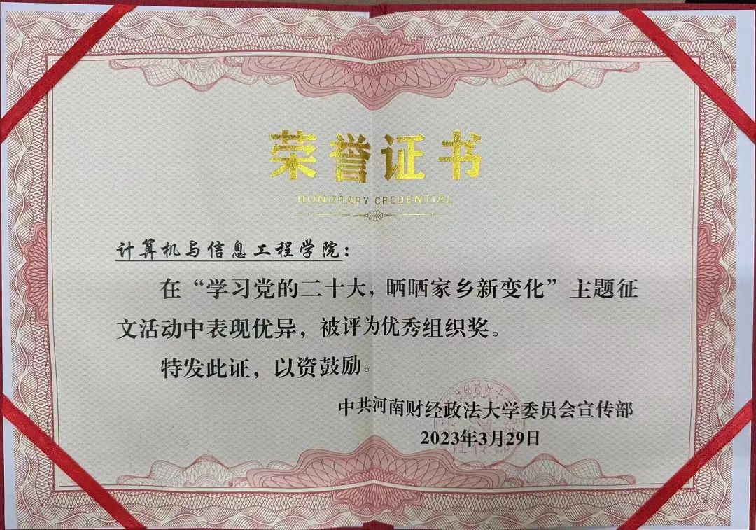 为深入学习宣传贯彻党的二十大精神,我校寒假期间开展了“学习党的二十大,晒晒家乡新变化”主题征文活动,在本次征文活动中我院共有四名学子荣获佳绩,我院也在本次活动中荣获优秀组织奖。