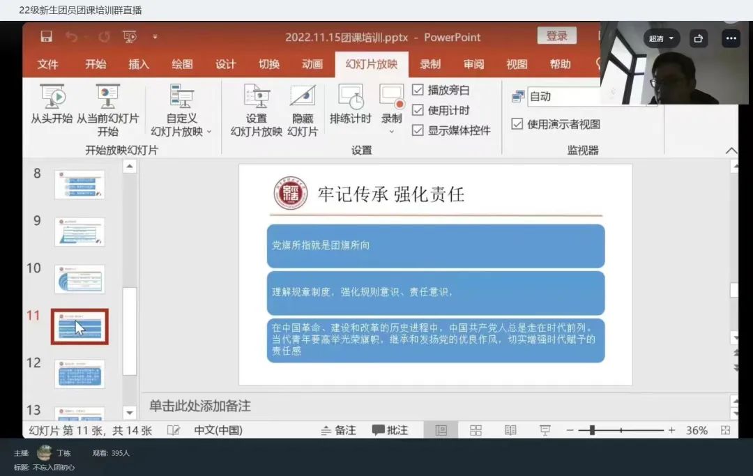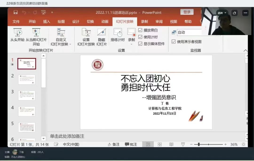 团课伊始,丁栋通过讲述本院优秀团员的事迹,引导学生认识身边平常人群中的"不平凡",理解身边默默无闻团体里的先进性,从而强化团员青年的身份意识和先进性意识。接着,丁栋通过学校团委品牌工作介绍和成果举例,让新生团员感受学院的优秀文化氛围和浓厚学风,加强学生作为学院发展主体的认同感,增强团员青年的学业意识、规则意识和责任意识。最后,丁栋借助祖国近十年翻天覆地的变化,让学生们在感受祖国日渐强盛的同时,增强学生的自豪感和荣誉感,提高思想觉悟,增强政治意识、组织意识和模范意识。