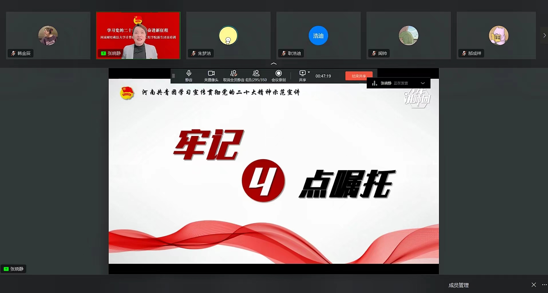 团课伊始,张晓静通过“中国范儿”这一青年人常用的高频词,引导学生带着“什么是中国式现代化”“中国式现代化与青年的关联”“未来在以中国式现代化全面推进中华民族伟大复兴的新征程上,广大青年又该担负怎样的职责”三个问题,在党的二十大报告中一同探究现代化这份“中国范儿”里所蕴含的核心“奥秘”。随后,张晓静通过“1234”数字归纳法,引导广大青年深刻理解中国式现代化的科学内涵,始终牢记总书记的殷切期待,坚定不移听党话、跟党走,执青春之笔,谱写新征程上更具中国范儿的现代化新篇。
