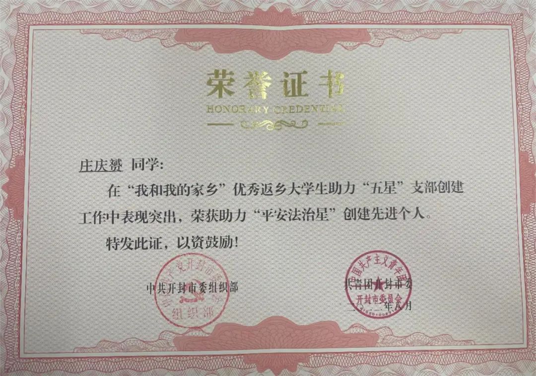 近日,我院收到来自中共开封市委组织部、共青团开封市委员会发来的感谢信 ,信中对我院21级同学庄庆赟在暑期期间返乡报到、助力战“疫”等工作表达了感谢和肯定。
