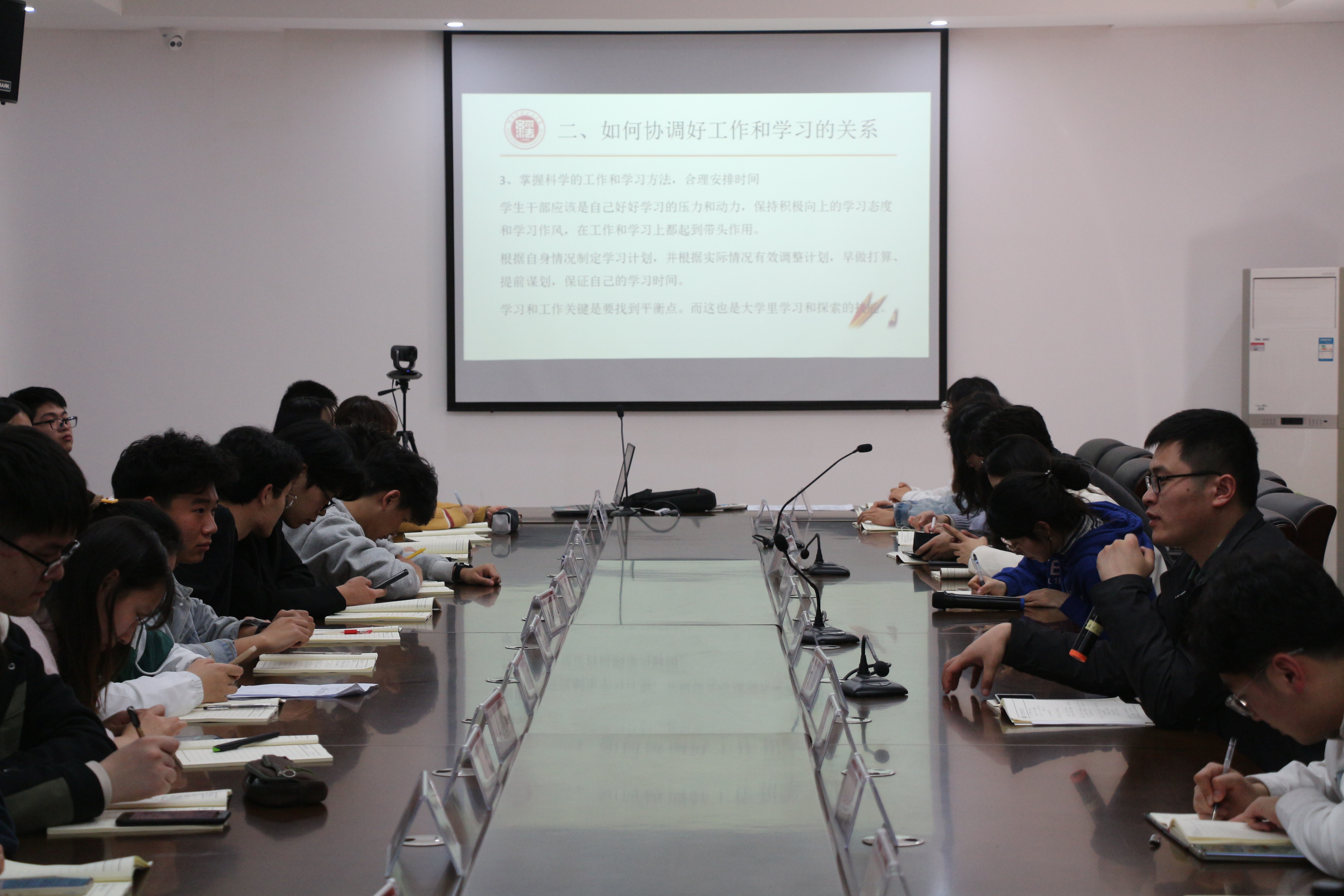 会上,学院各分管老师与部门负责学生代表汇报了上一周的工作开展情况。随后,由丁栋作为主讲人,以“如何处理好工作和学习的关系”为主题开展我院第三期“青马工程”培训。丁栋从认识工作和学习的统一辩证关系及如何协调好工作和学习的关系两方面客观阐述了工作和学习的矛盾性和同一性,同时提出三条建议,为同学们如何平衡工作与学习提供了方法参考。