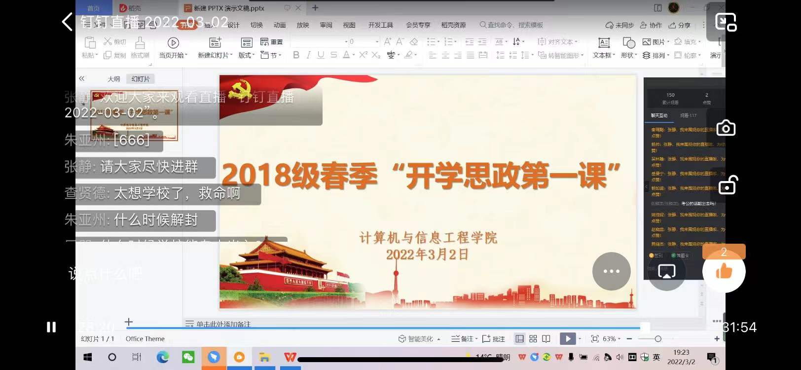 为深入贯彻习近平总书记关于“大思政课”建设的重要指示精神,全面落实《关于新时代加强和改进思想政治工作的意见》,2月21日至3月7日,学院以班级为单位,采用“钉钉”直播平台等新媒体手段,线上线下相结合的方式,分别开展“开学思政第一课”,全院学生积极参与。