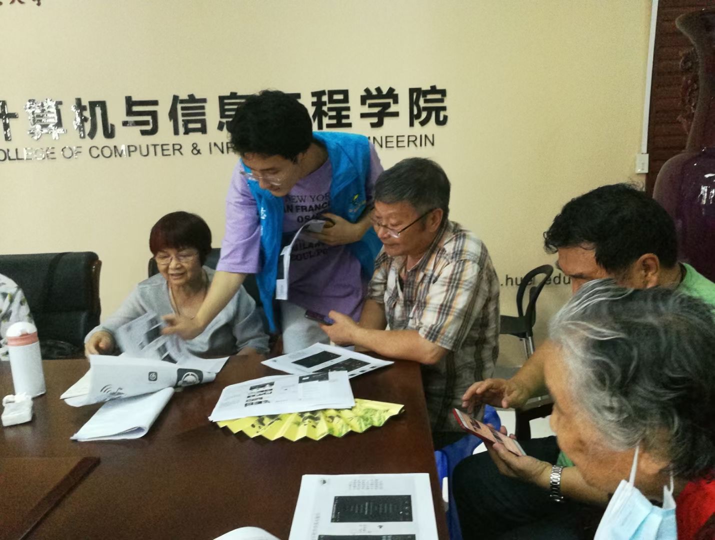 到了九点左右,老人们基本已经到齐,“夕阳再晨”暑期实践活动正式开始。每一位老人都拿到了一份由志愿者们所准备的学习资料,这一次的学习资料是关于对网易云音乐的下载与应用,由青年志愿者协会会长刘畅为老人们讲解学习资料。然后由志愿者们为老人所遇到的问题进行一对一的讲解。老人们对于所接触的新鲜事物表现出极大的兴趣,不停的追问志愿者们如何使用网易云软件相关功能如何使用。