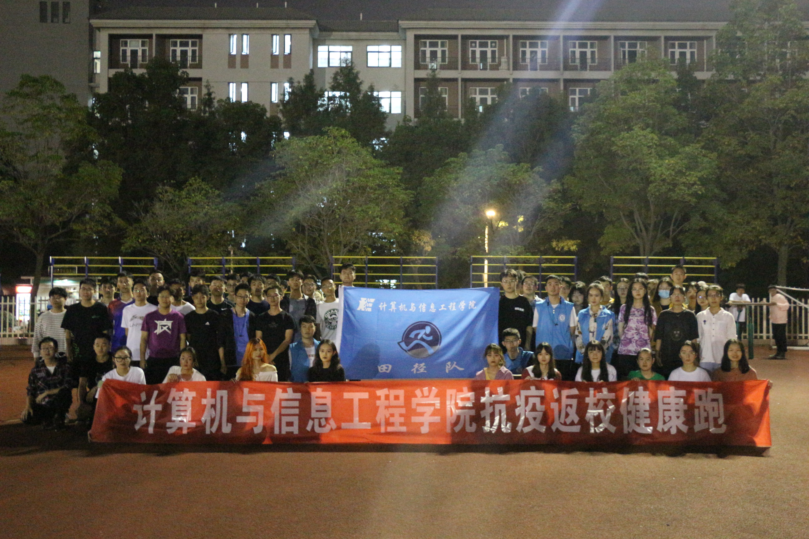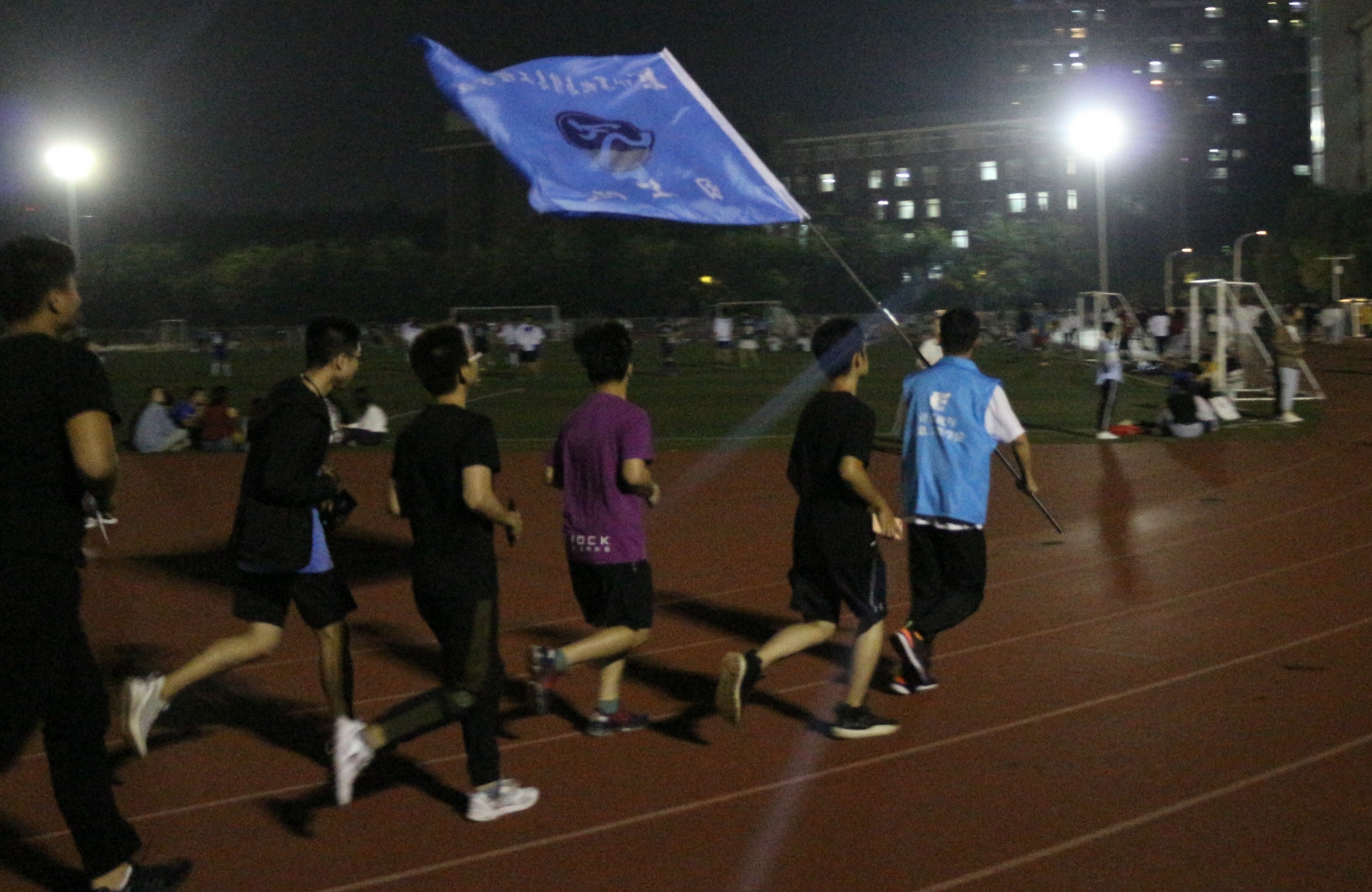 活动伊始,身着运动衣的同学们进入西操场,于单杠处集合签到。随后,在工作人员的引领下,同学们,有序进入跑道,以队列形式开始了跑步运动。晚风徐徐,同学们奔跑的身姿与飘扬的院旗一并前行,为夜晚的校园增添了一份活力。