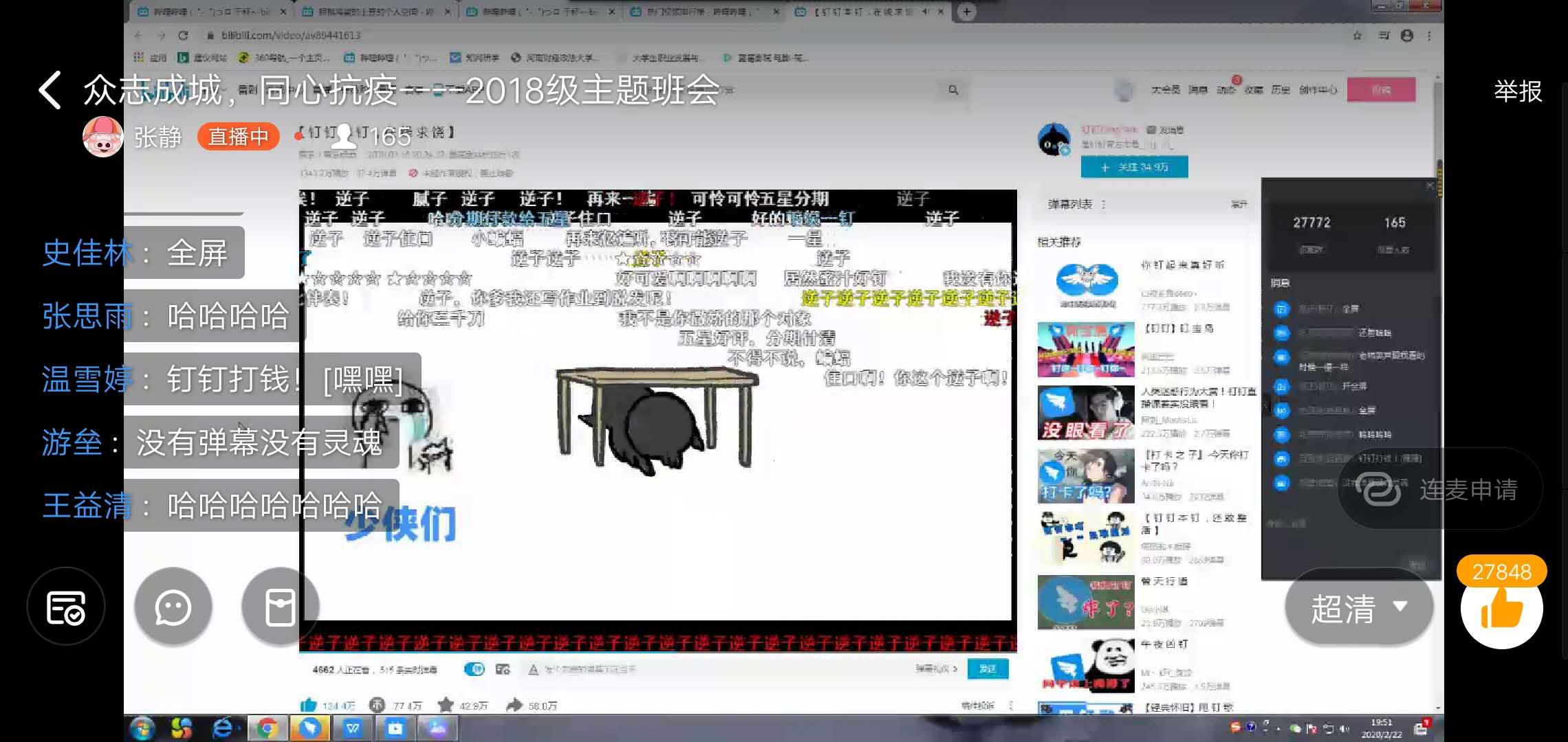 随后,老师们带领同学们观看了《武汉2020》、《战役之路》等宣传片,对疫情期间涌现的人民英雄事迹进行了交流学习,并通报了我院抗疫学生志愿者在家乡参与疫情防控的先进事迹。同学们也积极在留言区与老师交流互动,就如何佩戴口罩、居家健身方法、英语四六级学习策略、考研面试技巧等话题展开了热烈讨论,气氛和谐融洽。