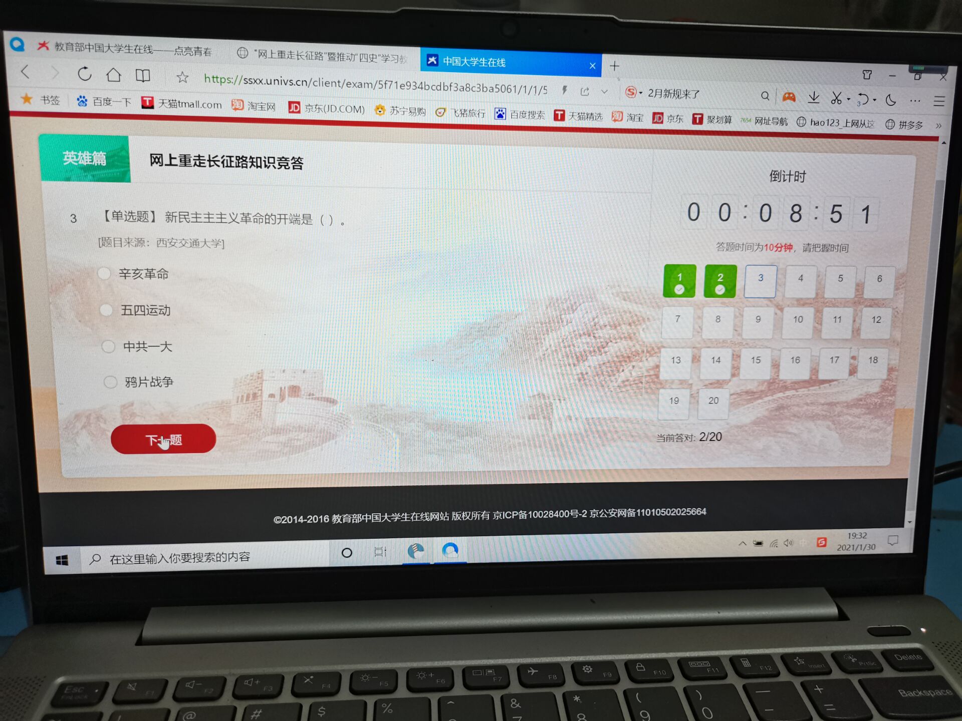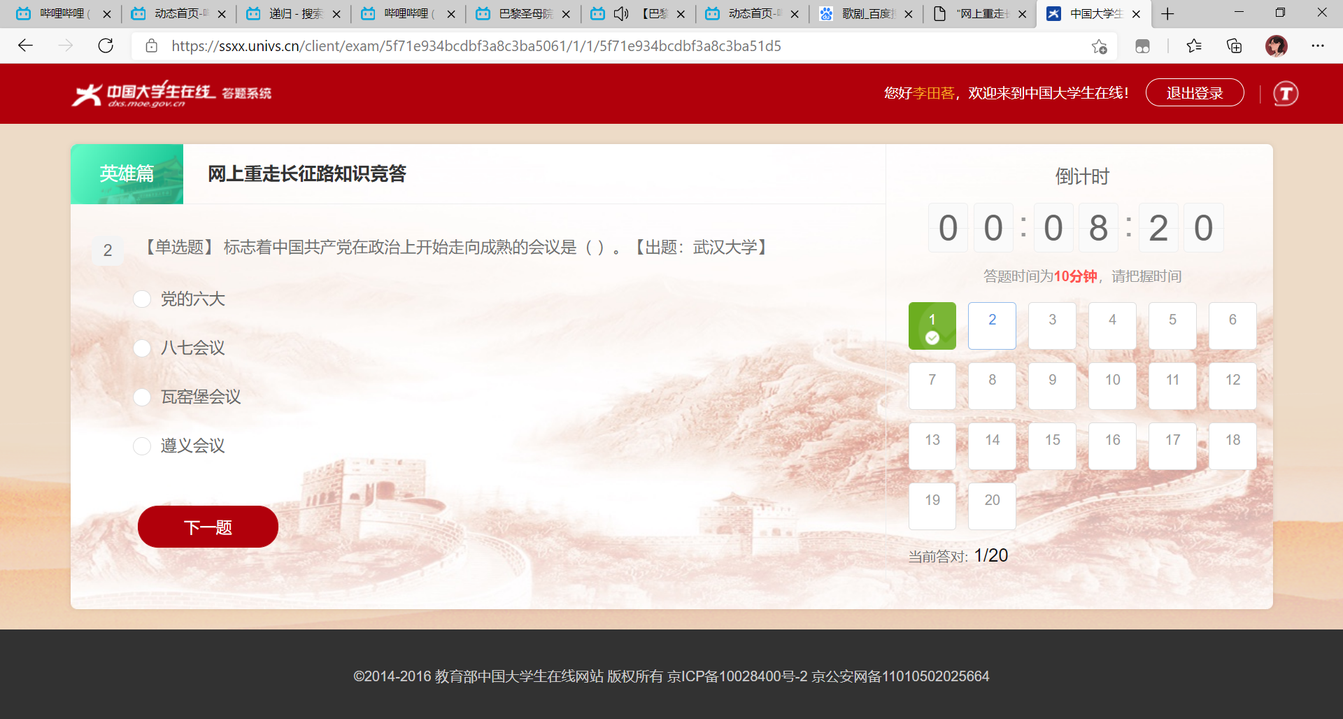 自1月30日起,学院就组织学生登录教育部中国大学生在线主页“网上重走长征路”暨推动“四史”学习教育专栏,并关注“中国大学生在线”公众号进入活动页面,进行自主学习与答题练习。师生以个人账号登录进入答题区后,可以选择普通模式或PK模式进行答题。答题类型为单选题和多选题。题目形态分为文字题、图片题、视频题。.竞答采取闭卷答题形式,时间为1小时,题目范围不仅涵盖了“四史”教育内容,也包括疫情防控方面的相关知识。竞答结束后,大家通过QQ群、微信群的方式积极探讨,分享学习心得。