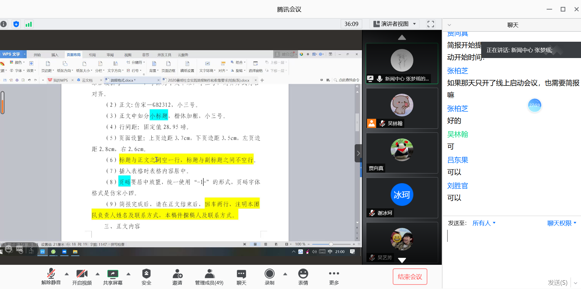 会上,吴林翰首先就本次实践活动的要求向同学们进行说明,他着重强调了安全问题,要求实践队员将自身安全放在首位,根据疫情形势变化随时调整工作安排。随后,他具体解释了本次社会实践活动的流程及内容,并由新闻中心部长张梦瑶做进一步的解释说明,解答了实践队员关于本次社会实践活动的疑惑,会议圆满结束。