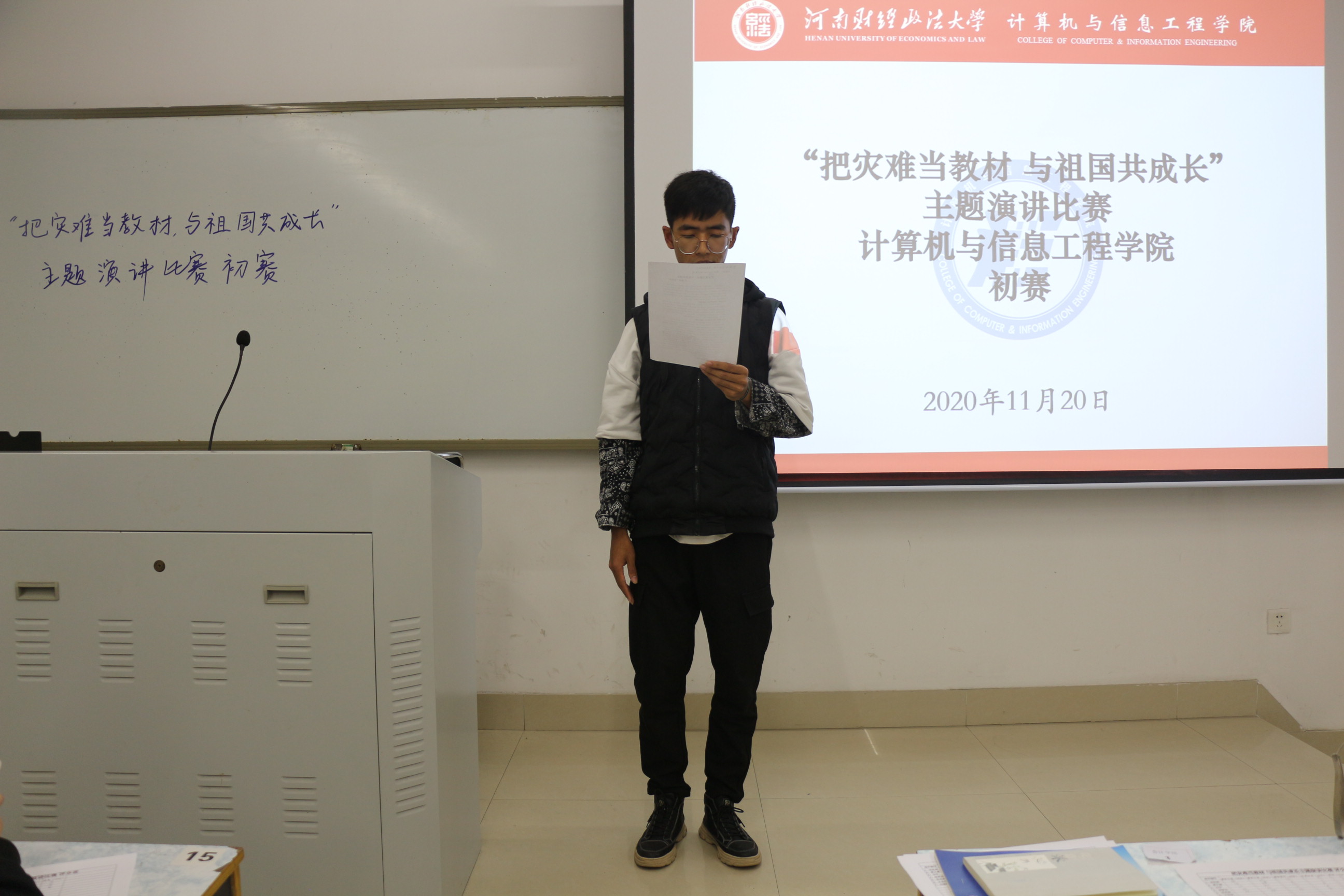 11月20日,我院于第一教学楼举办“把灾难当教材,与祖国共成长”主题演讲比赛初赛,本次比赛面向我院全体同学。