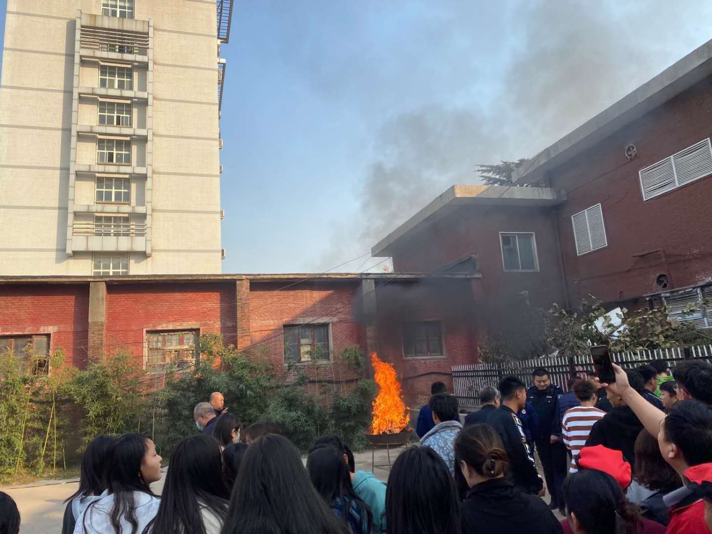 下午15:00,演练活动正式开始。首先,演练负责人向全体学生提出了三点消防意识要点,教导同学们保持良好的消防安全习惯,牢记火警求救电话,面对火灾时沉着冷静。随后,演练负责人向同学们讲解了火灾现场的应急处置方案,灭火器的使用原理以及相关的注意事项。并亲自演练了灭火器的使用方法。观摩结束后,学生们亲自体验了现场灭火的过程,面对熊熊燃烧的火堆,学生们沉着冷静,按照灭火的步骤和方法,将汽油燃起的浓烟大火成功的迅速扑灭,达到了本次活动的教学目的。最后,同学们在引导人员的指挥下依班次离开了空地,本次演习圆满结束。