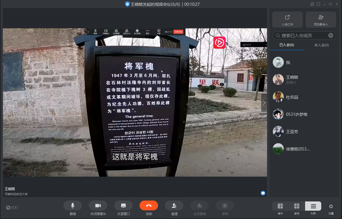 最后,小组成员通过观看“刘邓大军石林会议旧址介绍”的视频,近距离地对旧址的所有建筑设施进行观光浏览。从纪念馆的展览馆,即法隆寺门口进入,正直走进后,是刘邓大军石林会议纪念碑,再到会议室中,可以看到当时使用的子弹箱和电台,以及院中现仅存的一棵将军槐。