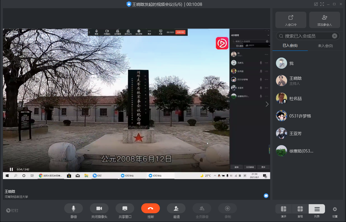 会议正式开始,通过共享屏幕的方式进入到鹤壁党史网中的“刘邓大军石林会议旧址”部分。小组全体成员共同浏览网页内容,从该会议旧址的简单介绍到石林会议召开的历史背景、会议的重要意义再到旧址的保护和开发情况,最后充分了解该旧址的管理及党史学习教育开展情况。在学习第二部分时,小组成员就其历史背景及重要意义进行了相关的讨论。在讨论过程中,其中一位小组成员提出“为什么‘石林会议’是中国革命的重要转折点”的问题,随后其余成员结合该会议的历史背景及当时的革命战况,参与了对于本题的回答。在第三部分的学习中,了解到旧址尚存的革命遗迹,其中有:将军槐、将军柏、刘邓首长当年使用的办公桌等。其中的将军槐当年由刘伯承司令员亲手所植。将军柏树龄约2000余年,树高约26米、树围约5.5米、树冠覆盖面积约156平方米。被当时平原省称为“华北第一柏”。晋冀鲁豫野战军驻扎石林期间,两位首长常在树下商讨、研究军事战略,故称之为“将军柏”。