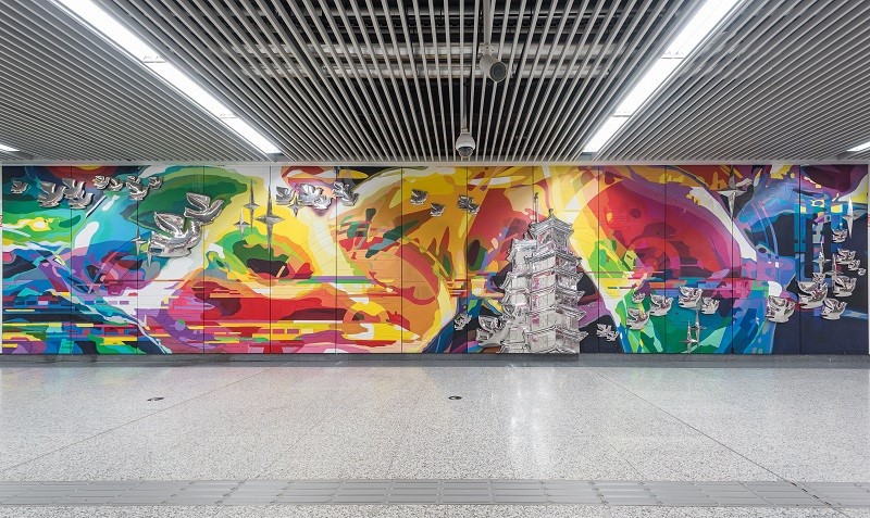 壁画用二七纪念塔和飞翔的鸽子、闪耀的星光象征无限的希望,抽象与具象相得益彰,这是郑州人民的五彩梦。实践团的成员们来到了二七广场站观赏这幅承载着郑州古往今来的壁画。画面里隐约可以看到当年“二七大罢工”的汽笛、徽标及火车大车轮、高铁等,通过对壁画的深刻解读,队员们了解了当年“二七大罢工”的象征意义,也见证了郑州的飞快发展。