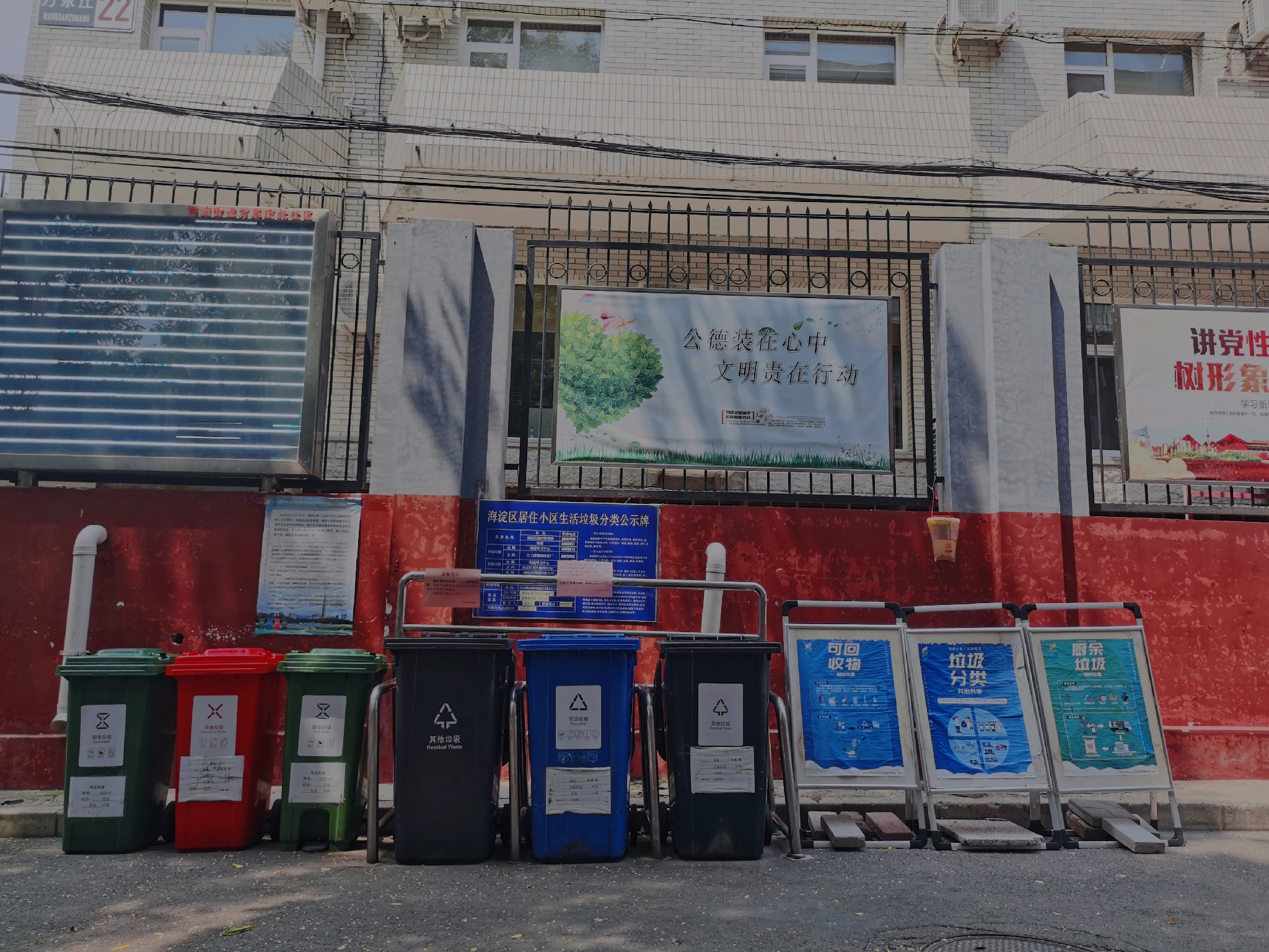 在后面的街边勘察中,队员们已经感受到新时代文明的宣传已经处处可见。人们在公交站带头的瞬间,大幅的宣传海报就在公交站牌对面。下楼扔垃圾的时候,垃圾桶上方及桶身上就有垃圾分类的标识和分类方法。餐厅前台有免洗洗手液和文明用餐的标语。这一系列的变化都是新时代文明的渗入。在看到新时代文明的宣传,学习到新时代文明的思想后,团队队员对于后来的实践活动就有了更深的体会。社区里的一片垃圾,贴上的一张海报,都是在向新时代文明迈步。