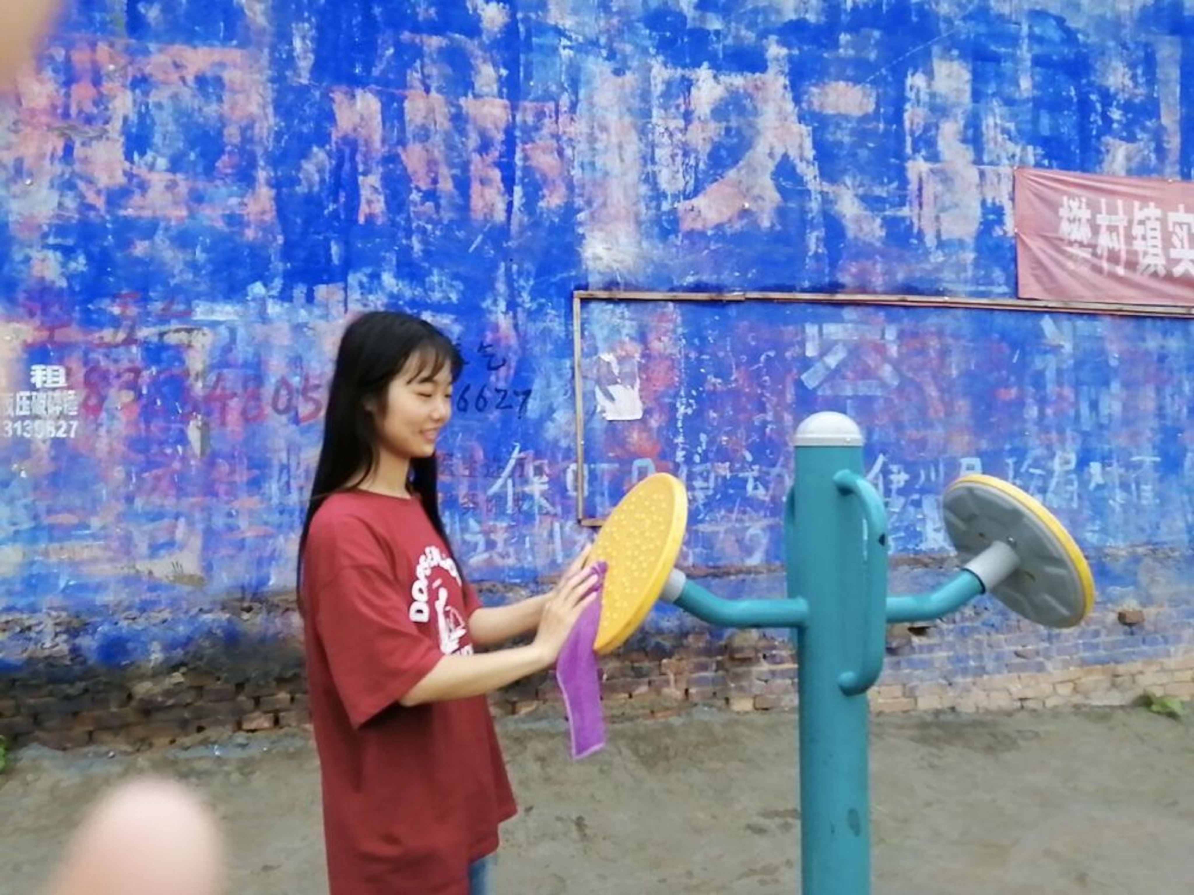 在帮助叔叔阿姨练摊的同时,实践队员发现社区卫生也需要进行维护。于是午后实践队员来到社区的各条道路、楼道、花坛和电梯里,进行打扫工作。实践队员清洁了白色垃圾和墙壁非法粘贴的广告,擦洗了社区的健身器材,还给群众一个干净整洁的生活空间。