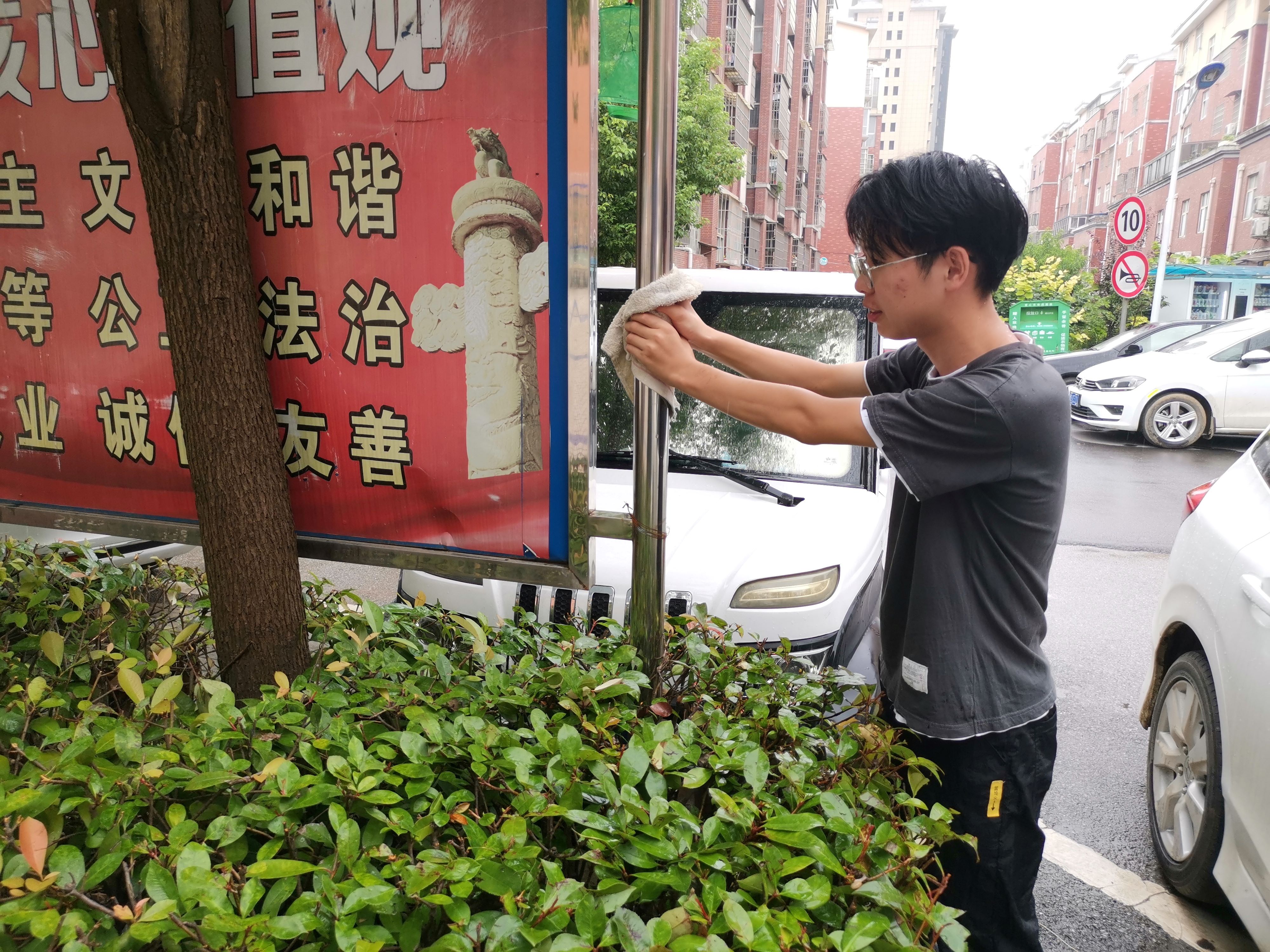 社区是我们每个人生活和经常出入的地方,实践队员看到经久的告示牌上布满了灰尘,实践队员主动地从家里拿起抹布,卖力地擦拭着上面的灰尘,直到告示牌崭新如初,与周围的美丽风景融为一体,实践队员脸上洋溢出幸福的微笑。实践队员的举动,为社区公益做出了贡献,也让年久失修的告示栏焕然一新,使人看了赏心悦目。不论盛典还是灾难,不论是大事件还是小场合,每个需要帮助的地方都能看到志愿者奔跑着的身影。没有掌声,没有鲜花,没有报酬,用一颗跃动着爱的心,完成着爱的传递,将汗水融化成满脸笑容,快乐他人同时也快乐自己。