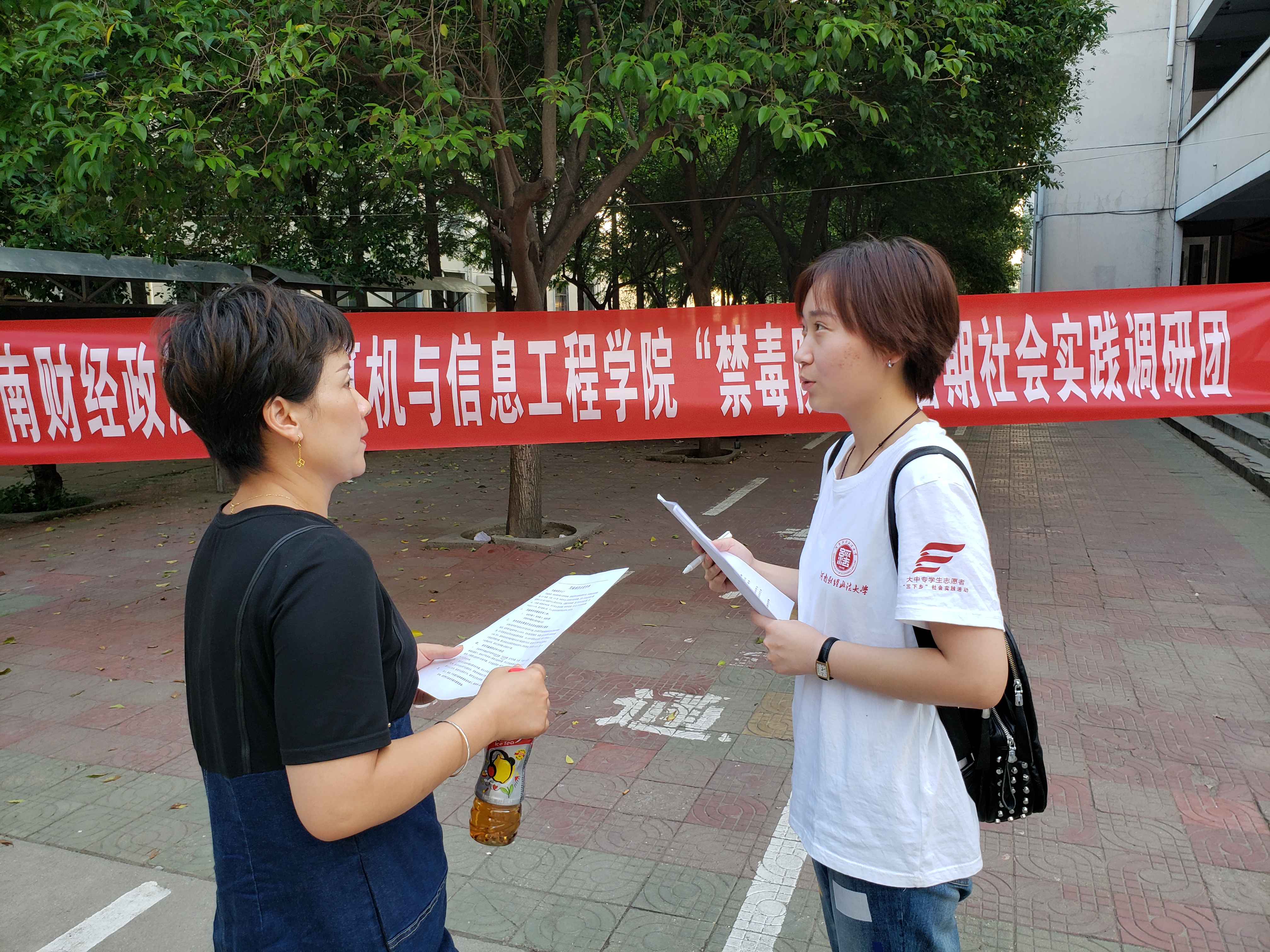 首先,队员们在校门外发放宣传单,对门卫及过往路人进行艾滋病防治的相关调查。随后,队员们走入校园,在校园人流聚集区拉起横幅,对路过的老师、同学进行采访,询问他们对艾滋病的了解情况,并对他们的回答进行讲解补充。