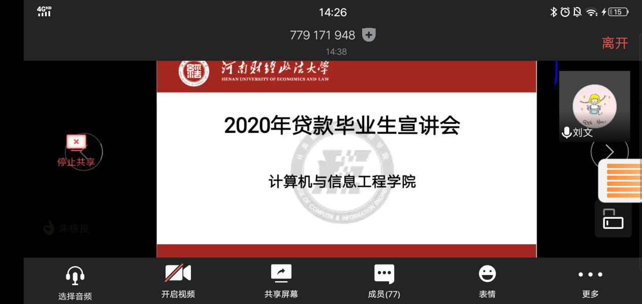 为引导我源毕业生正确使用国家贷款,帮助我院毕业生顺利步入社会,2020年5月15日,我院资助中心于腾讯会议平台举行了校园地、生源地国家助学贷款宣讲会,我院应届毕业生及学院资助中心工作人员参与了本次会议。